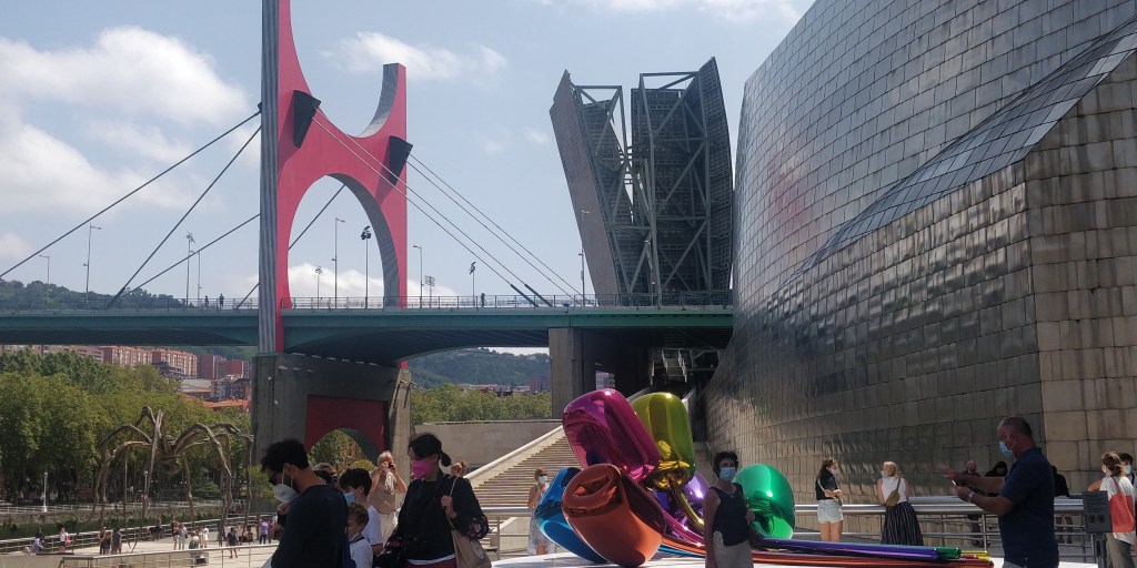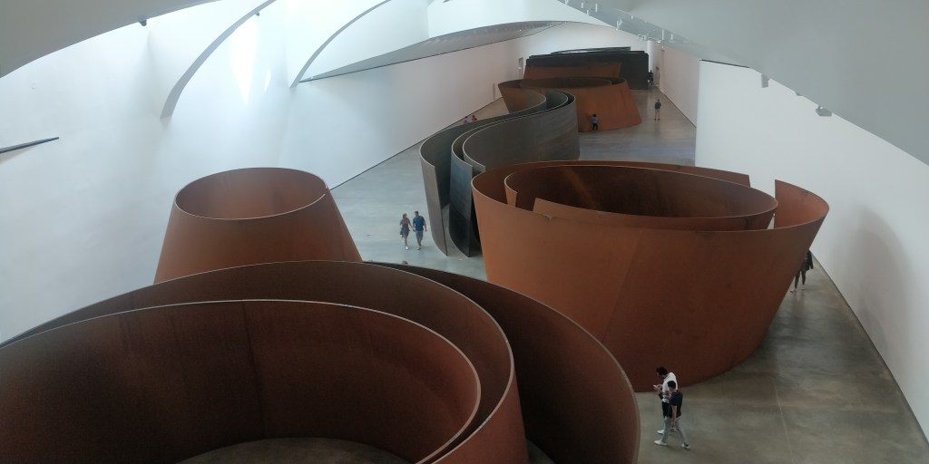 The huge attraction in Bilbao is the Guggenheim and once you lay eyes on it, you see why. This weird floating structure rises out of the river, part boat, part fish and winds under a bridge.  Buskers were playing classical music outside which only added to the gentle craziness of the whole experience. There’s a enormous colourful sculpture of a puppy, planted with real flowers on the plaza outside…defying all perspective. The website said that tickets must be bought online but we decided to see if we could get in anyway – there was a short queue and after about 10 minutes, we were in without issue (again no checking of covid certs). The building inside is just as disorientating as you’d expect – we had difficulty finding the exit.