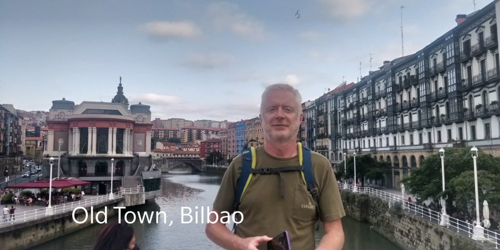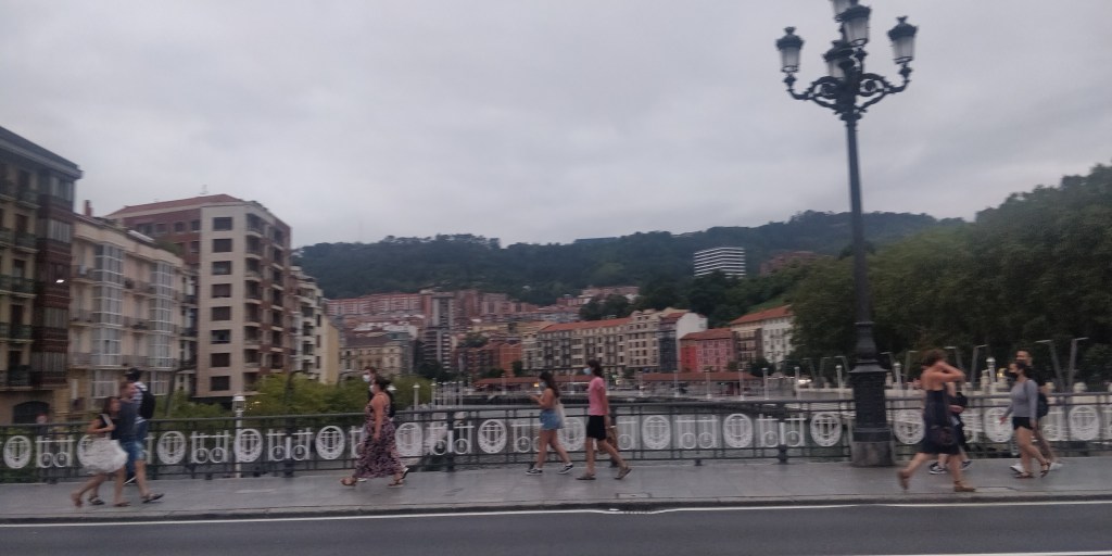 Bilbao is a green city, settled into hills and mountains. The centre fits neatly into the horseshoe shape made by the river. Looking up and down many streets, we could see the surrounding mountains in both directions. But the big surprise was that nearly everyone was wearing masks outside – not just indoors or in shops but just walking down the street. However we were never asked to provide our Covid certs anywhere or questioned about covid tests.