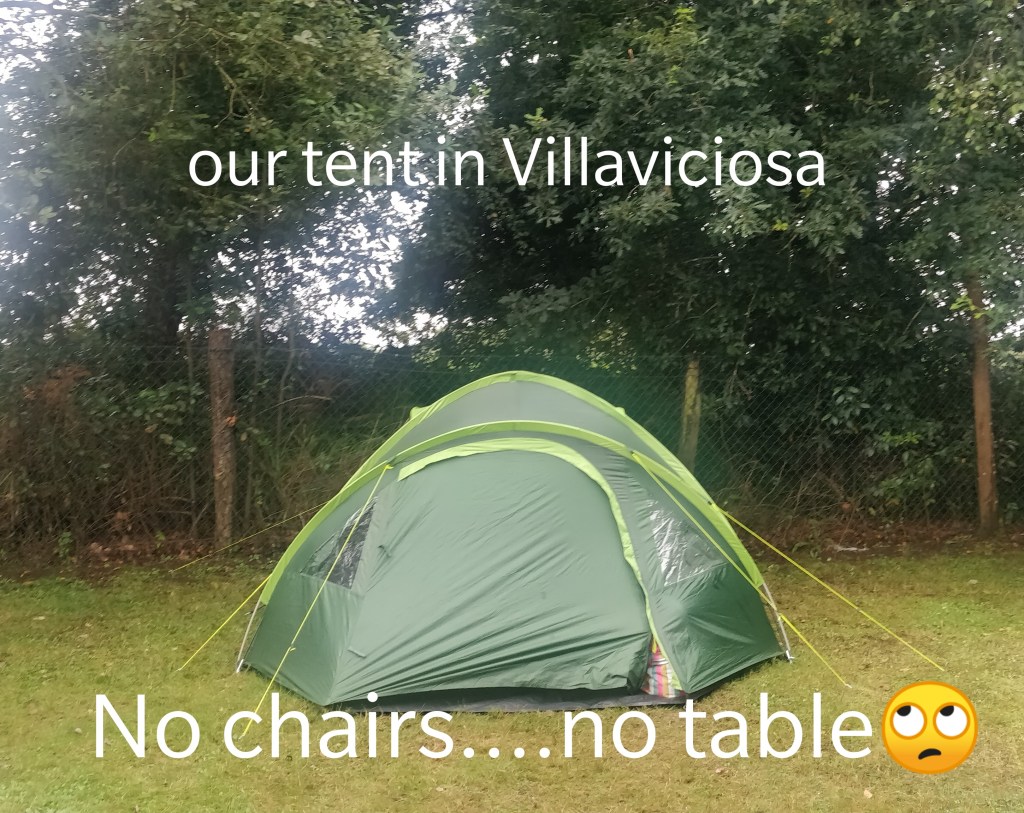 We set up camp for the night outside Villaviciousa in Asturias – some other campsites nearer the sea were full and when I say full, I mean jammed – barely room to walk between tents although they would probably have squeezed us in somewhere. It was mid-August and a holiday weekend. We put up the tent under the trees and then discover that we have forgotten to bring the camping chairs and table – we have left them in our garden shed. We had been complimenting ourselves about how well we had packed. Now we knew why everything fitted so well into the car!