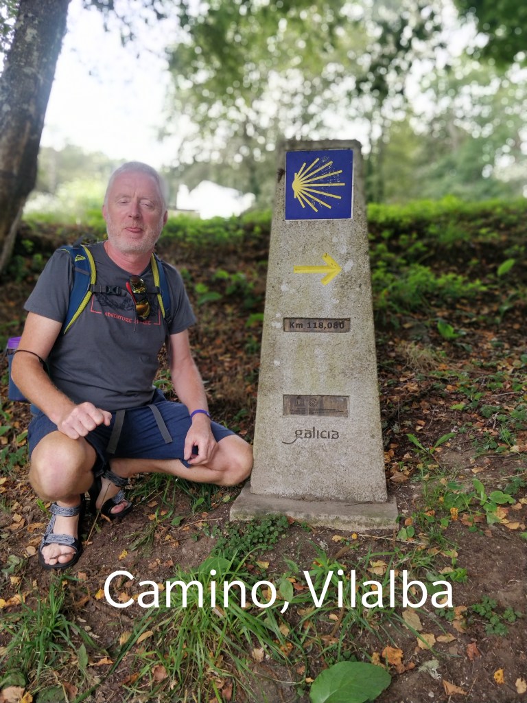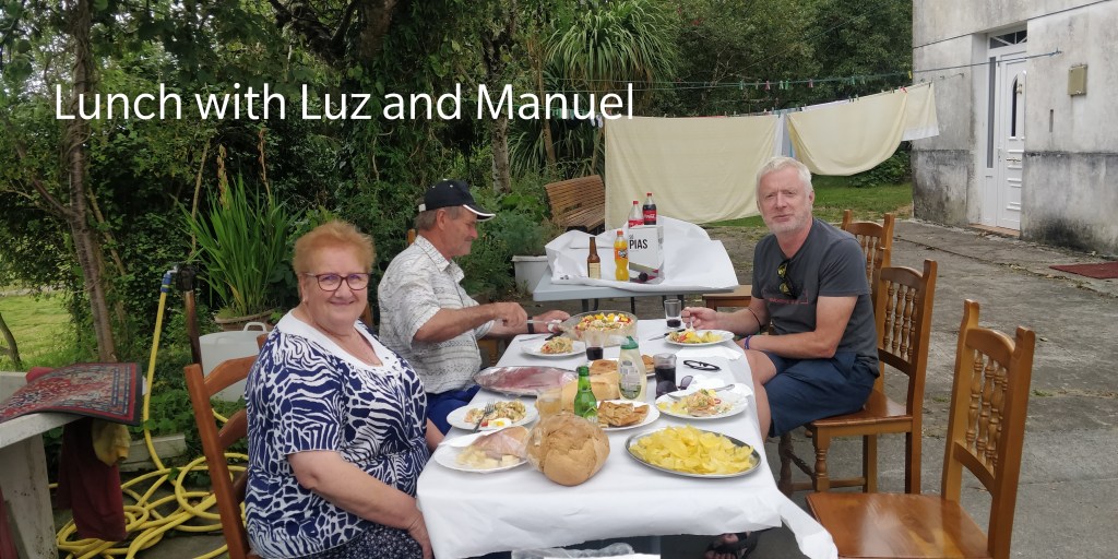We stayed with a relative – my brother in law’s mother, Luz – for a couple of nights in her house about 10kms outside Villalba, an inland town in Galicia but which is on the Camino del Norte. The countryside around here was green with hedgerows of wildflowers (very similar to home) and small farm holdings with a few cows (with enormous horns) and farmers driving old tractors. There were rows of windmills on the horizon and mixed forestry plantations. But the countryside was also dotted with lots of large, deserted houses – substantial buildings with peeling paint. Sometimes there were several clustered together in small, deserted villages. Fine houses that would be habitable with a little TLC are left to crumble and decay where their (usually) elderly inhabitants die.