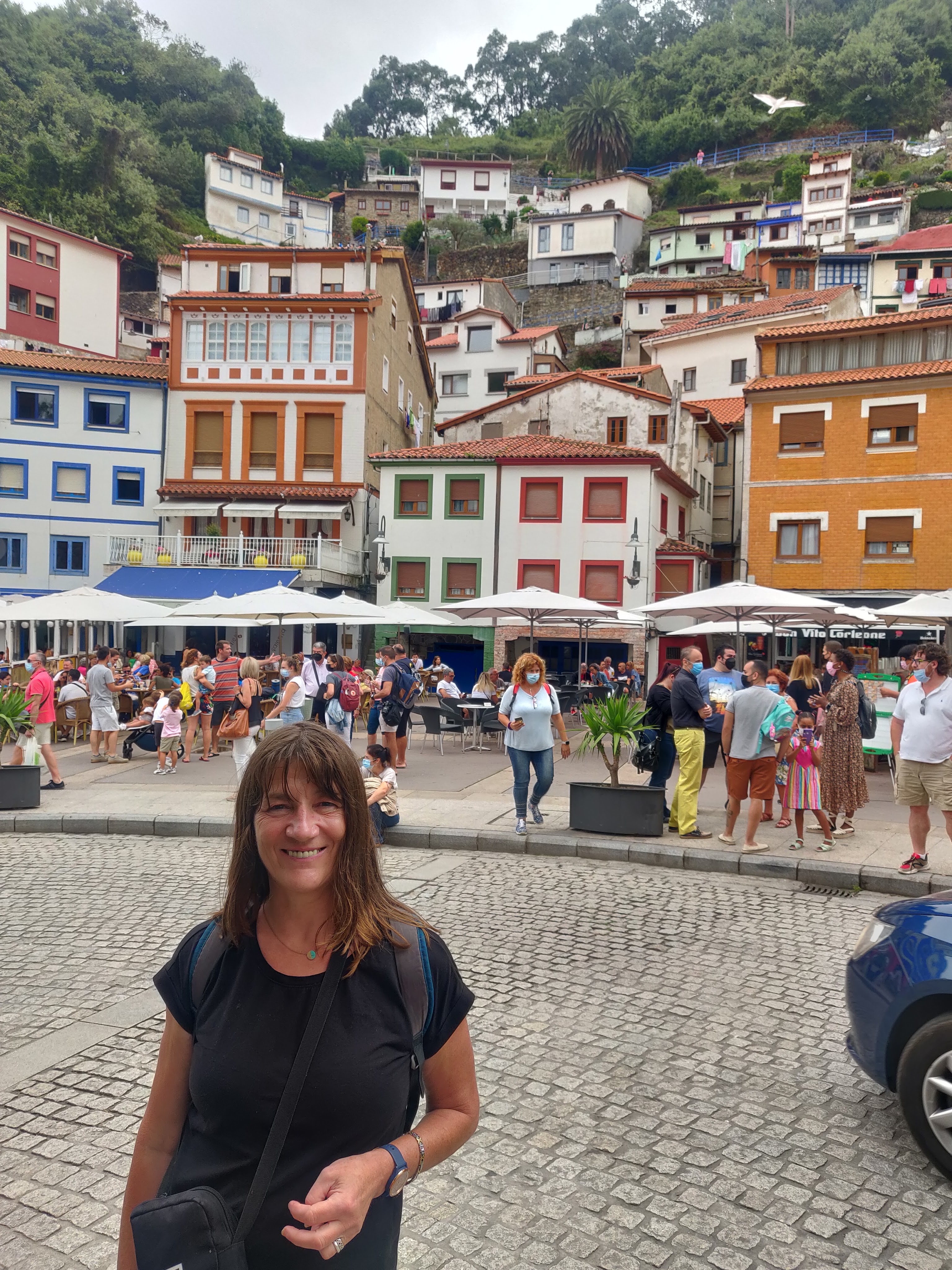 After one night camping and sitting on the wet grass (it rained all night – the only rain for weeks), we moved on, still following the coast with the blues of sea and sky to our right and the greys and greens of mountains to our left with a mist blowing over the Picos. There were tiny coves with towering cliffs and red tiled houses clinging to sloping mountainsides.