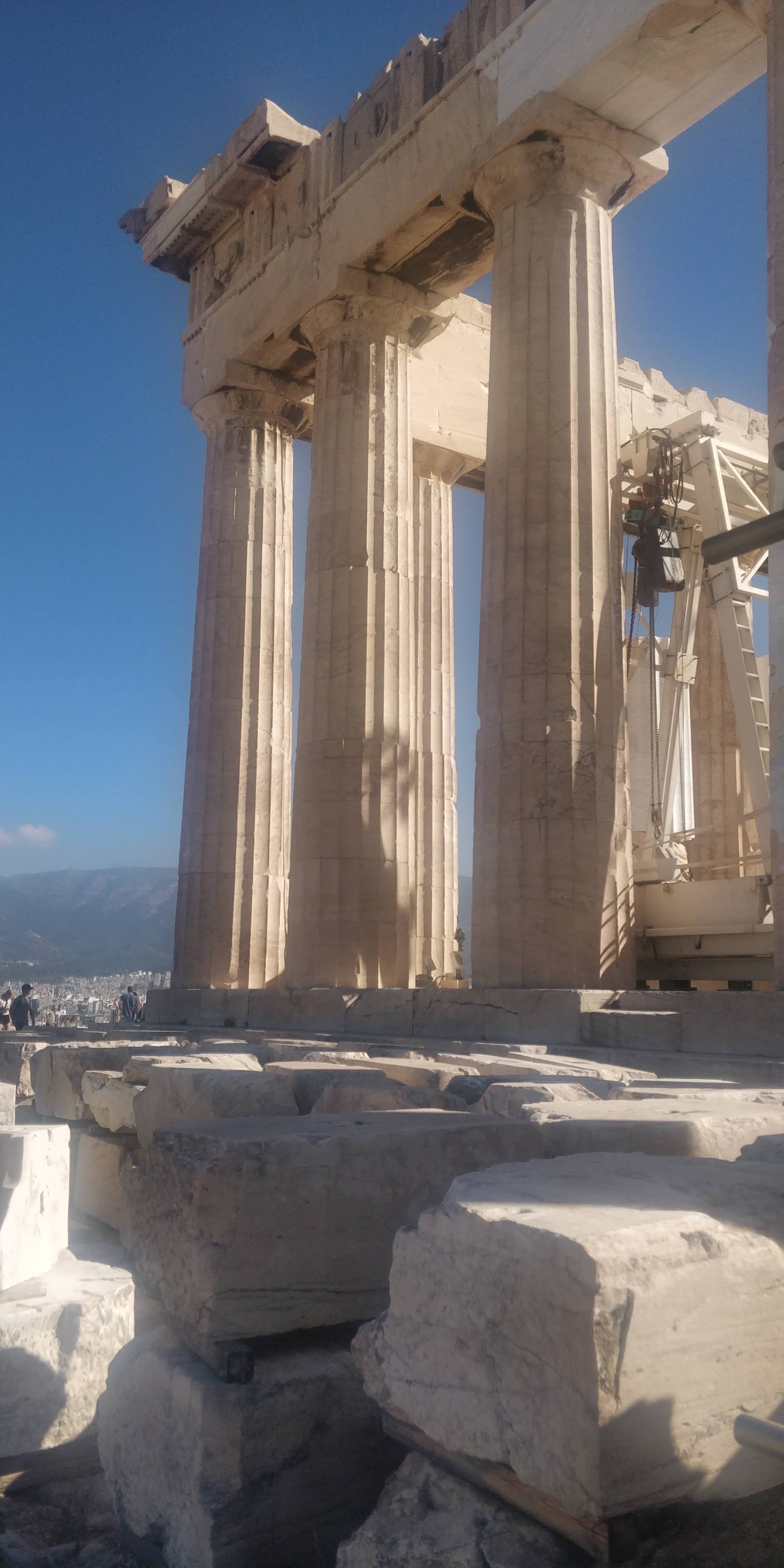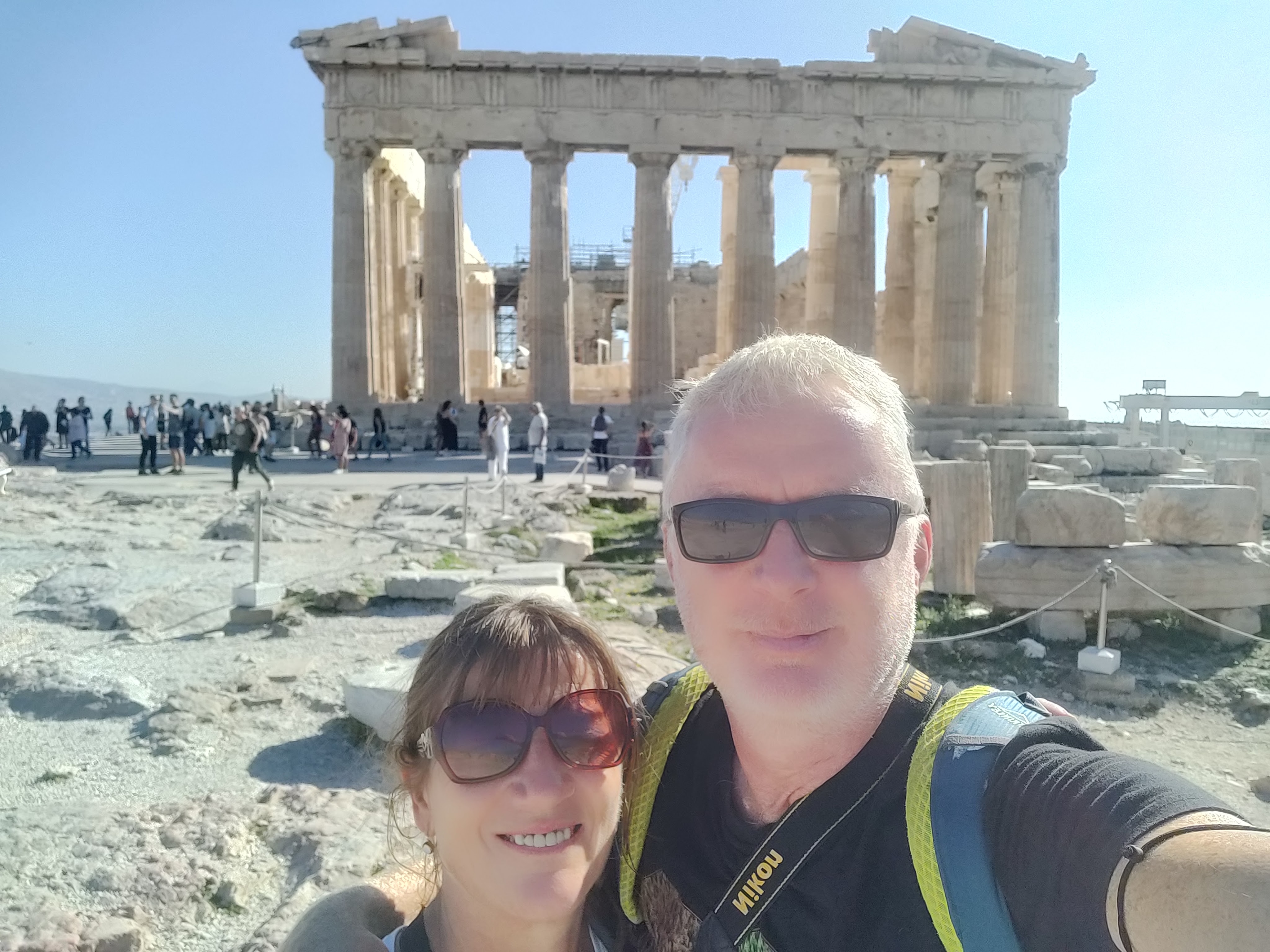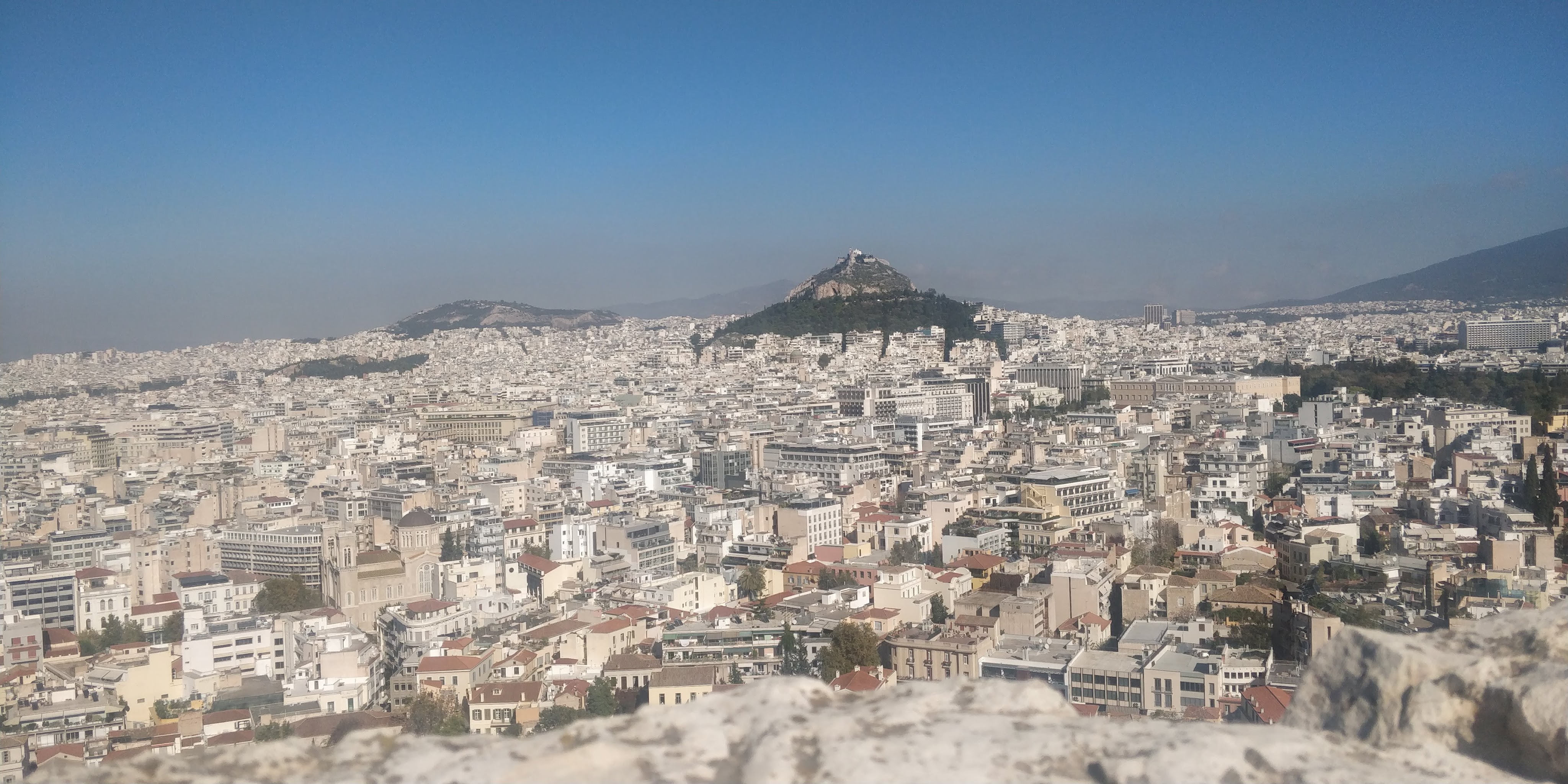 Onwards to sprawling Athens (we paid road tolls this time- a first for us) and what a surprising delight Athens was. This was our first visit and our expectations were low but in the November sunshine the city glowed. We parked in an underground carpark about 15 minutes walk from the Acropolis where the parking attendent was so helpful, I asked if he was a tour guide. I have wanted to visit theAcropolis for a long time and it didn’t disappoint – the photos describe it better than I ever could. The buzz of English speaking voices (British, American and Aussie)in the short queue was a novelty for us, we are usually surrounded by Greek voices (that shouldnt be a surprise in Greece). Outside the Pantheon, Caoimhin pulled a half bar of chocolate from his pocket, I had some in my mouth, when we heard a whistle blowing and a large middle-aged woman descended on us telling us that it was forbidden to eat. We apologised, swallowed our chocolate and laughter because as soon as we had entered the Acropolis, we had sat under a tree and happily munched on pasta salad and olives that we had brought with us without realising that we had transgressed any rules. But it entertained us to hear the frequent whistle and spot the latest culprit who had pulled out a sweet, a cigarette or gone the wrong way round although it wasn’t obvious which was the ‘right’ way. The markings on the votive pillars where almost three thousand years ago, people’s requests were carved in stone and offerings made for health or weath or the blessing of children. Little changes.