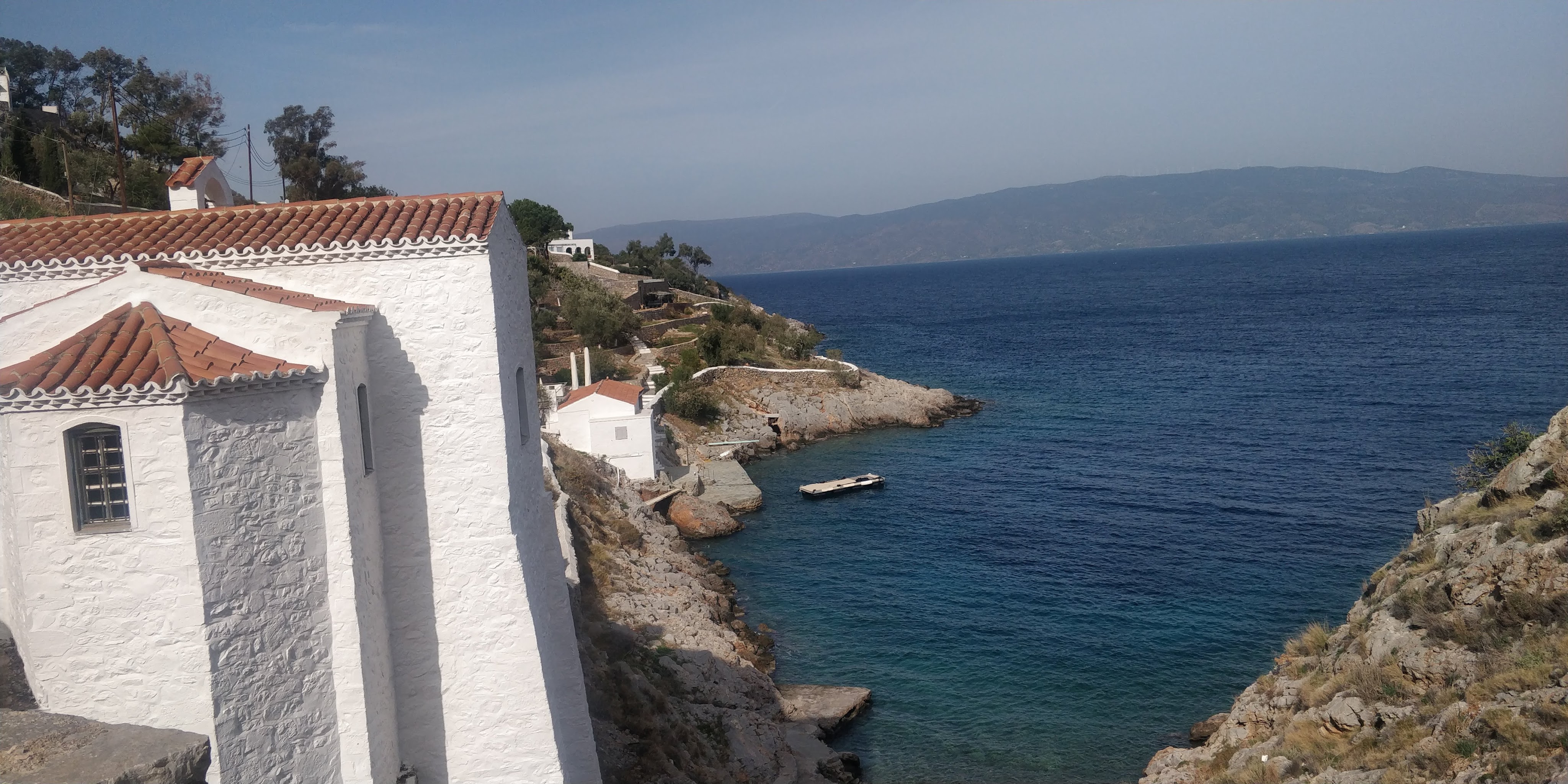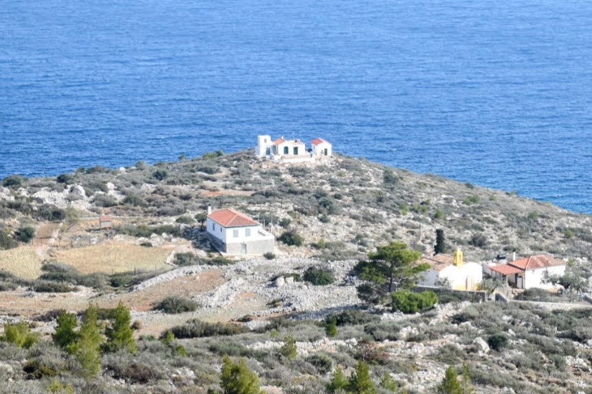 There were dozens of pebble beaches, great diving from the rocks into deep blue water but the real charm was wandering the back alleys where everyday life went on away from the tourists in the port, where old ladies gossiped and struggled uphill with their shopping, children screamed in the schoolyard and workmen hammered and repaired roofs Upwards into the hills along steps, mule trails and stony paths, there were monasteries on hilltops and little blue and white churches everywhere – I’m convinced that there must be a church for every resident. An old lady in a red cardigan sat sunning herself at the gablend of her remote house with chickens clucking around her and dogs at her feet waved to us as we clamboured up a rocky slope. One day, after a strenuous hour and a half uphill hike, we stopped at a tiny church, the green field surrounding it stood out amongst the grey rock and spiny plants – the only green field we saw on the whole island. Inside amongst the icons and holy pictures, there were bottles of water, juice, crackers and – wait for this – a half-empty bottle of Powers whiskey (we didn’t partake – honestly). I couldn’t resist lighting candles in such a little sanctuary in the mountains (I have been accused of becoming a right Holy Joe). And everywhere, the slow pace and the silence where the main sound was the tinkling of bells around the necks of the donkeys and mules and the sound of the sea – without traffic – and the soft November light and the smell of the salt sea, jasmine and donkey dung.