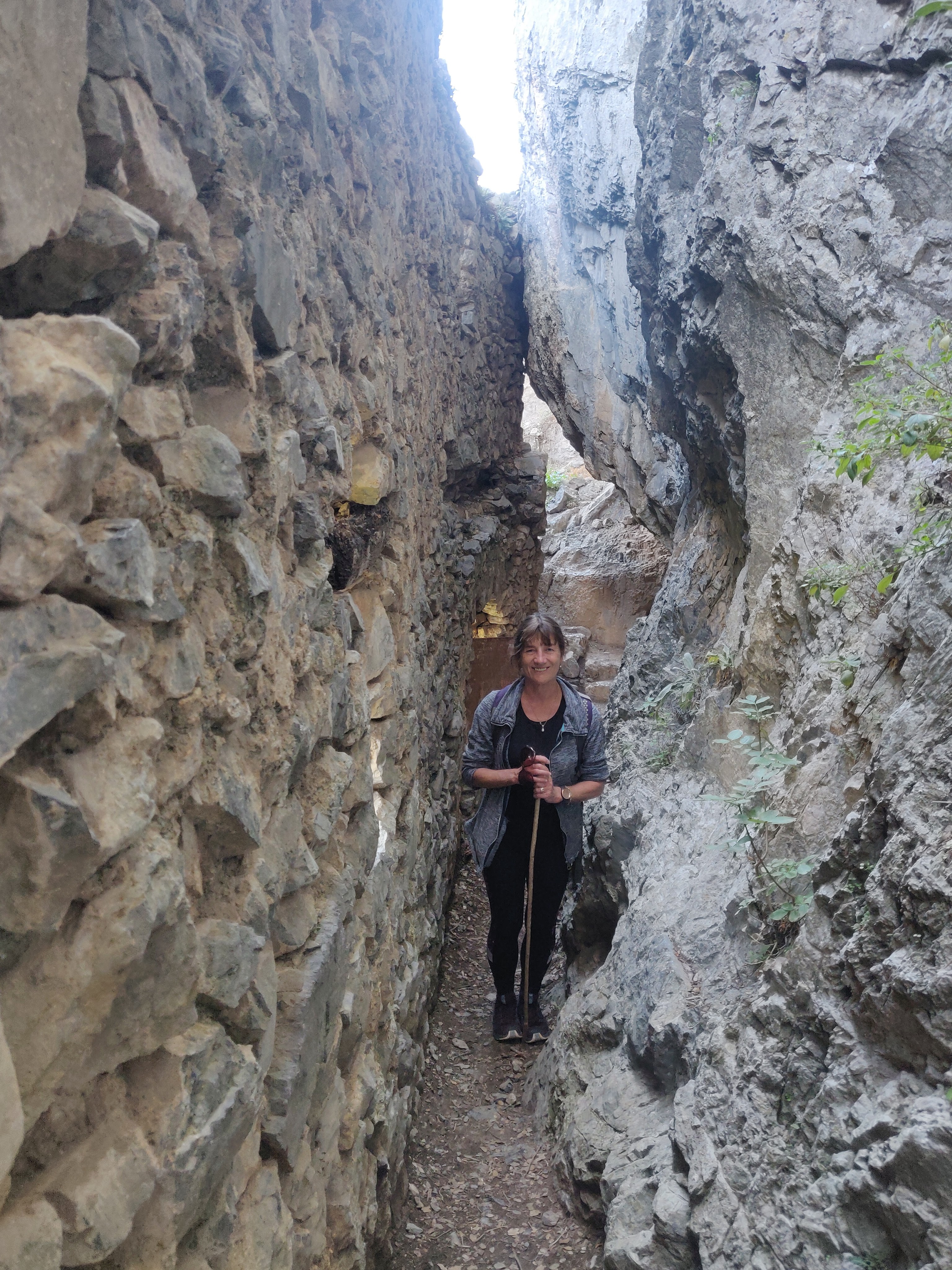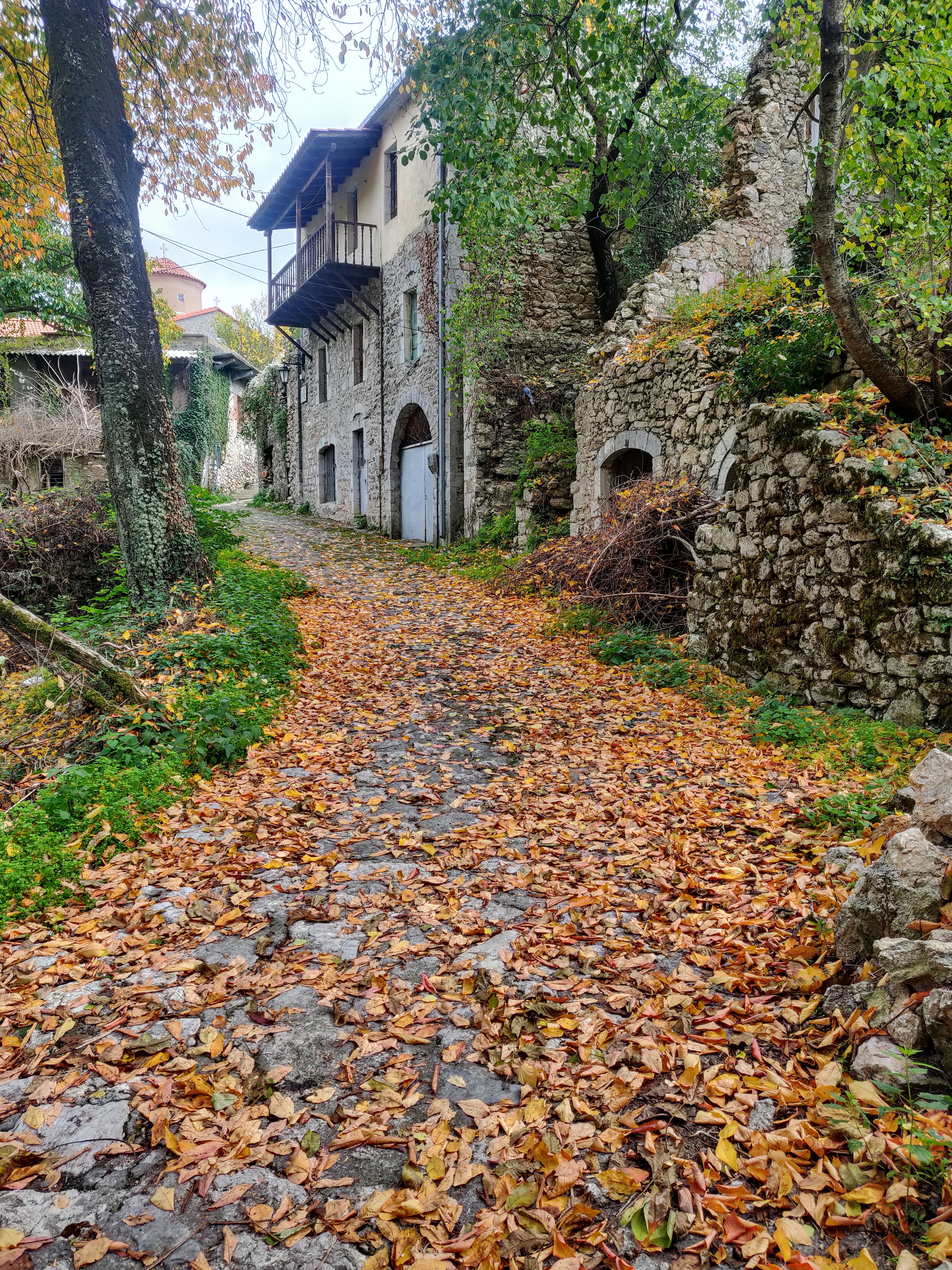 The Mendalin Trail and we could have been in Ireland as we walked the section from Dimitsna to Stemitsana in bright cool weather with the golden autumn colours of the birch, oak and sycamore trees, the fallen leaves, moss -cloaked stones and peeping mushrooms but then there were the monasteries with black robed monks, the ruins of gunpowder mills that produced ammunition for the 1823 war of independence from the Turks. The following morning, our gorgeous bedsit view had dissappeared, hidden under a blanket of thick fog that didnt lift until nightfall (about 5.40 as the clocks went back here as well). No hiking for us that day although we dashed in full waterproof gear to probably the best bakery in Greece up the street and gorged on baklava, chocolate dipped shortbread and pitachio and lemon biscuits – so always a silver lining.