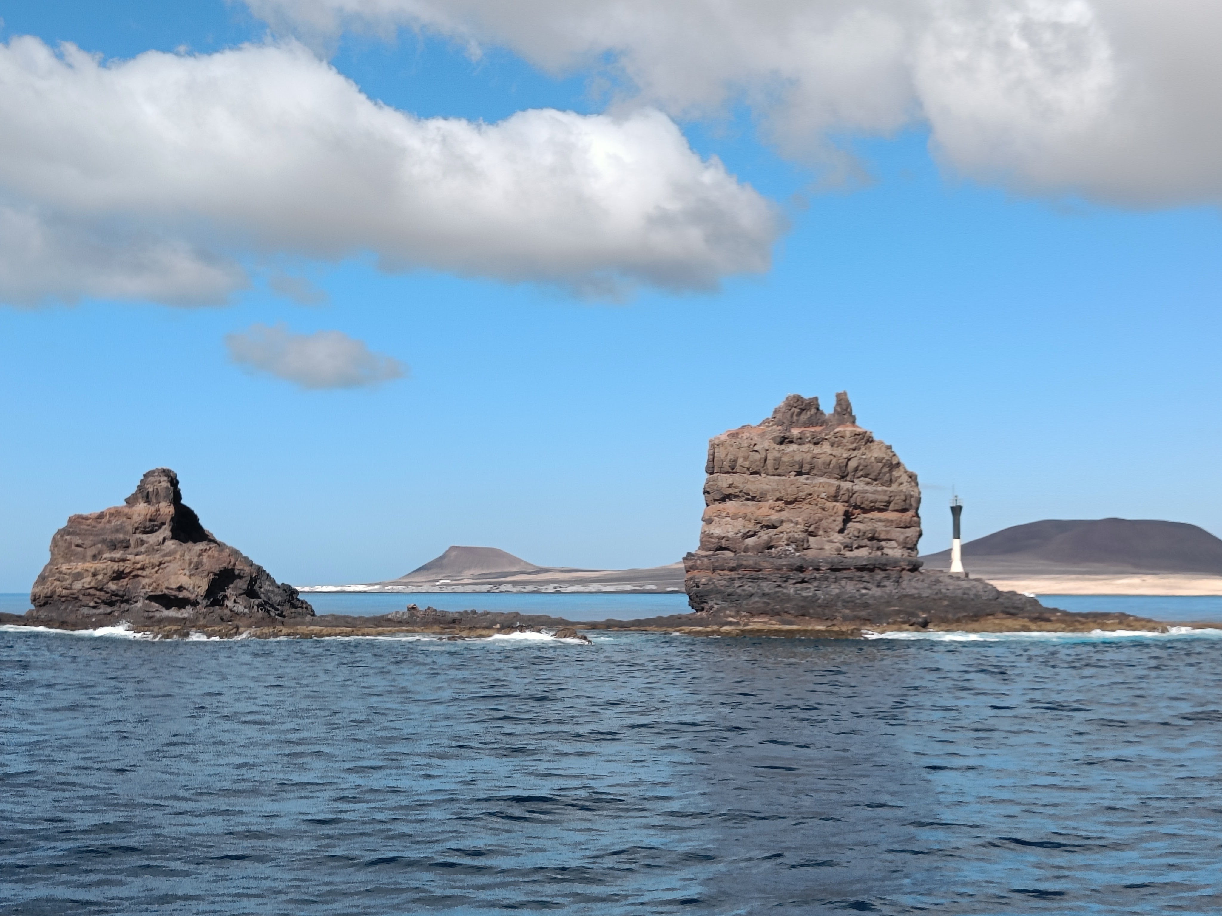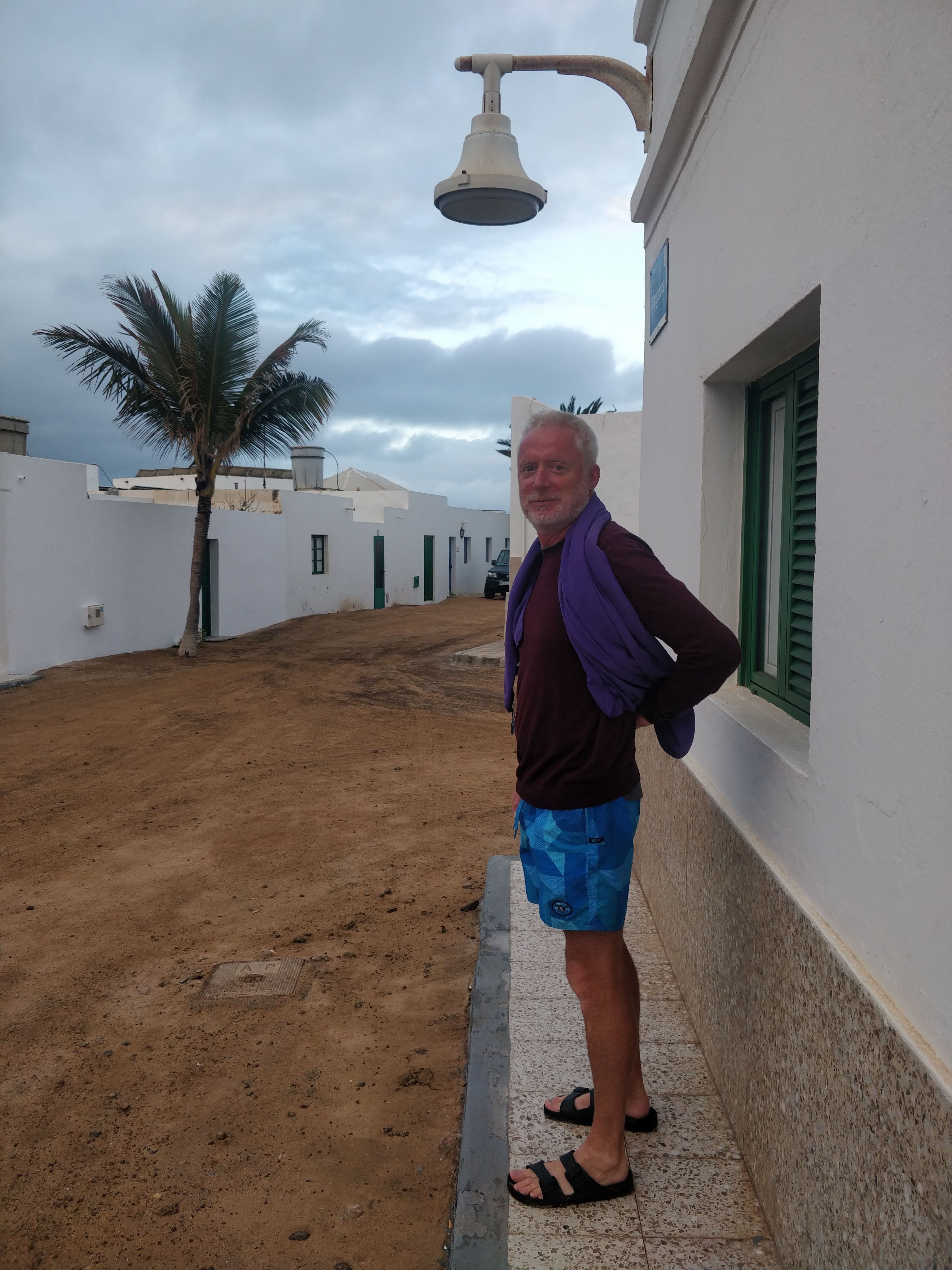 During the thirty-minutes ferry ride across the Strait of El Rio, the Bueno Vista Social Club played through the speakers on deck and the sea shimmered in time to the music. Caleta del Sebo, the only town on the tiny island gleamed white against the yellow of the sand and the tan of the hills. Seagulls circled over the small fishing boats which all seemed to be painted blue. We wondered if Cesar Manrique’s decree on colour extended to the boats on aesthetic grounds😀. The town was spread out, long and low, all the houses painted the obligatory white and blue. Most people on the boat were day trippers and were soon sucked into the many cafes, beaches and bike rentals places. We dragged our suitcases (the 10kgs plane cases) along the sand to our beachfront apartment, which was gorgeous, decorated in soft greys with a splash of yellow, and at €80 a night was significantly more expensive than our usual budget. We hiked to the south of the island, walking along blond beaches and rock pools teeming with life to swim in cool turquoise waters and watch clouds float by. The joy of retirement☺