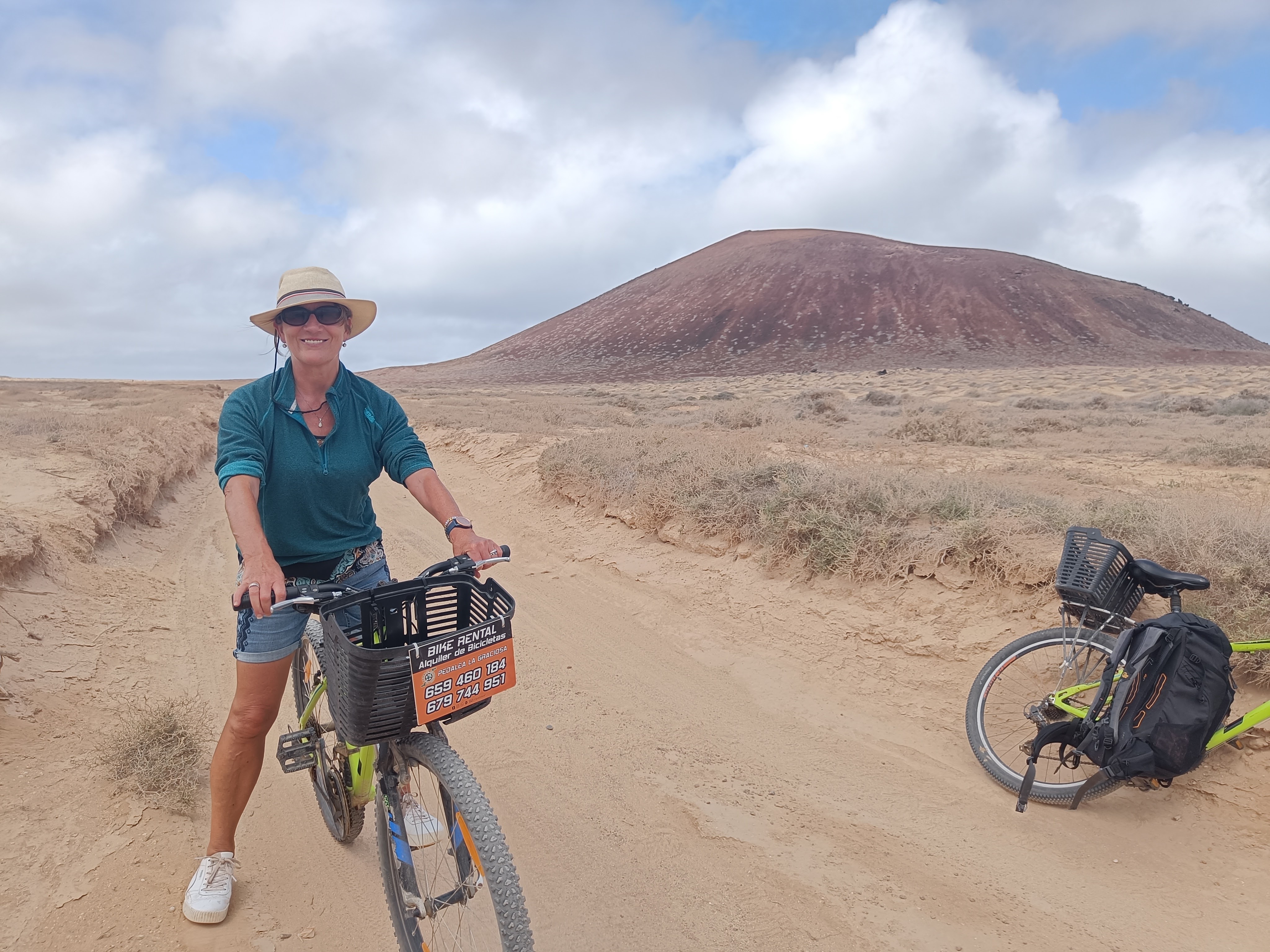 Most visitors came off the ferries and hired bikes to tour around the island and most didn’t realise what they were letting themselves in for…us included. Paved roads were non-existent anywhere on La Graciosa so vehicles were limited to a few dusty jeeps- really charming- but the rough surfaces also made cycling quite challenging. The island had an arid beauty with no trees in the interior but that meant no shade or shelter. But we were gobsmacked by the beauty – the surfing beach of Las Conchas, the basalt arches of Arco de Los Caletones and the area around Pedro Barba with its summer houses. The sun was intermittent with spotty rain on a strong crosswind and mists rolled down over the hills of Lanzarote so we didn’t have to deal with the intensity of strong sunshine. We cycled through soft sand in sections or shuddered on very rough terrain in others. It was tough going although we considered ourselves reasonably fit. On our return loop, we had sympathy for the sweating people starting out who were already struggling on the easy bits. But it was worth it!
