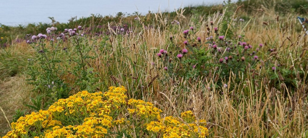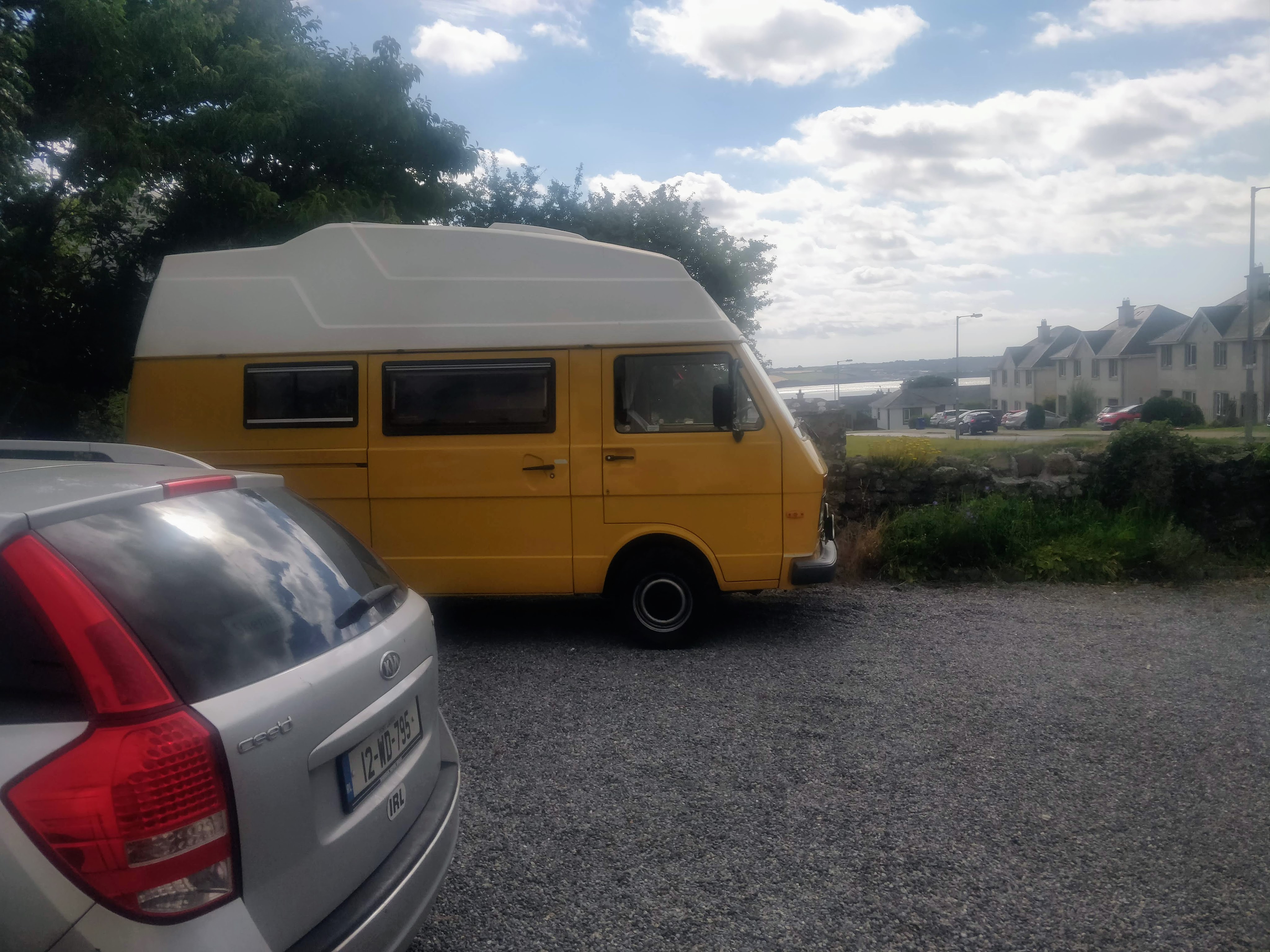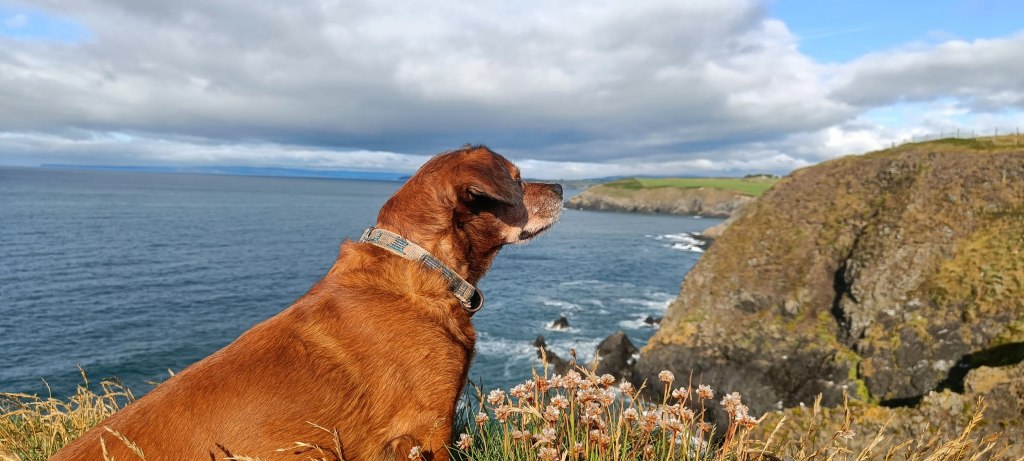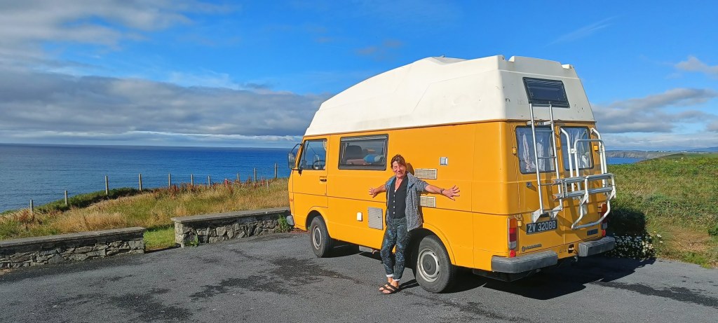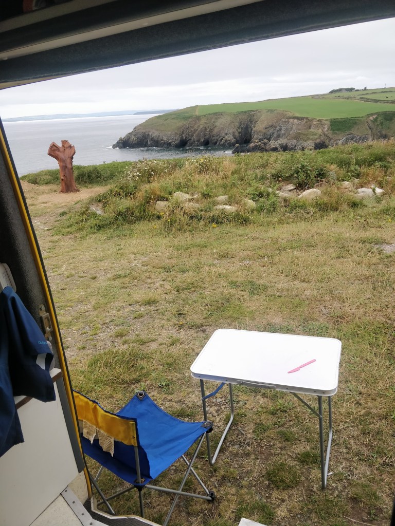 On the August Bank holiday, Spuds. (the campervan that we had borrowed to tour Mayo) was still parked outside our house waiting to be collected. It seemed such a waste not to use it again – it was almost begging us to go for a spin! So we set off on Saturday with Rolo, our dog, who has become a very enthusiastic campervanner, not really sure where to go. Waterford city was crowded with families enjoying Spraoi – we stopped for a wander around to look at the acrobats, the dancers and street entertainers. Great atmosphere but the sunshine disappeared, swallowed by drizzle so we bought an umbrella (which were selling like hot cakes or greasy burgers at a festival😁) and ran back to Spuds . We drove out of town towards the Copper Coast.