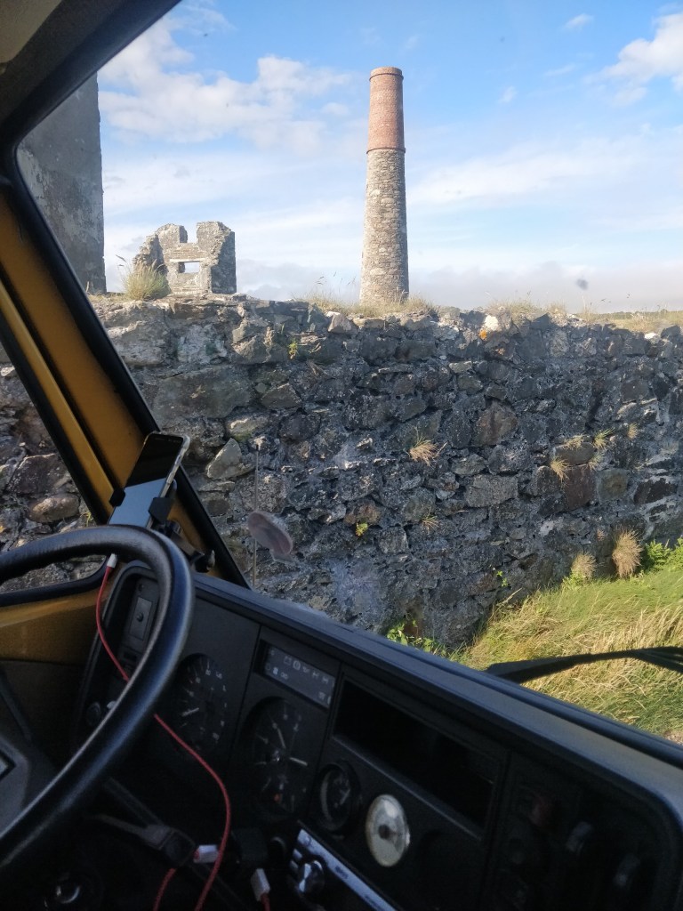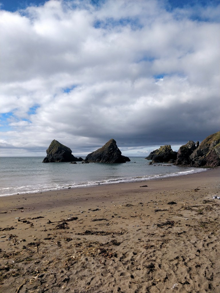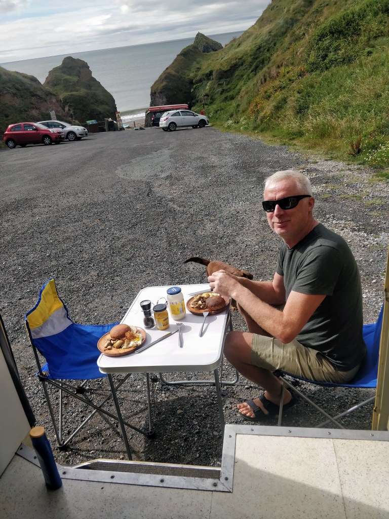 We parked for the night at the viewing point at Dunbrattin Head, a headland of fossils and prehistoric forts. There should have been stunning views but the rain was running down the windscreen and the wind was buffeting the campervan and it felt strangely like being in a boat out at sea. But it was somehow soothing, we slept well and in the morning (Sunday was a spectacularly beautiful day), the views were revealed as a landscape shaped by fire and ice and sea,