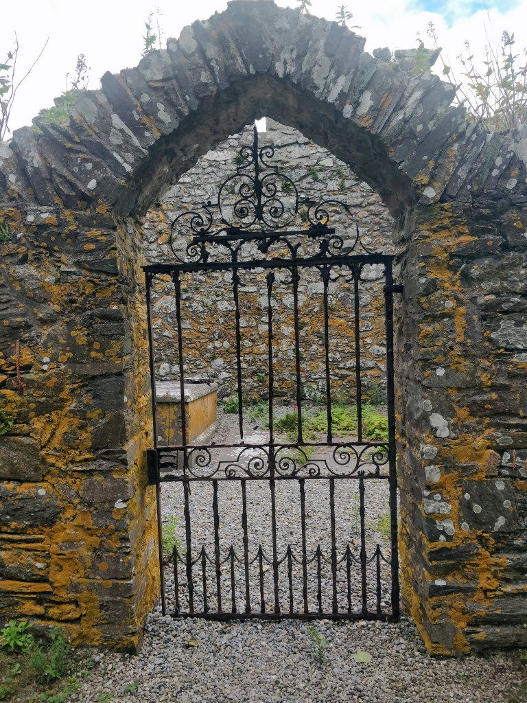 We drove to Ballydowane Bay and after a walk on the beach, we cooked up a breakfast and ate sitting outside the van in the sunshine. Fried eggs never tasted so good! There are wonderful storyboards at the beaches on the Copper Coast and the walk on Ballydowane was described as a ‘500m walk through 460 million years of Earth history when this part of Ireland was a volcano on a deep ocean floor, a dessert near the Equator, a land savaged by ice sheets and glaciers’. Sheer Magic We drove by rugged Ballyvooney Cove under a dramatic headland and on to Stradbally, a picturesque village with a lovely square, brightly painted houses and some thatched dwellings. We wandered around the old graveyard on the hill with the ruined church and ancient gravestones tiling forward – an air of tranquillity on a warm sleepy summer Sunday. The tide was way out in Stradbally Cove, a narrow sandy beach with steep wooded hills on either side and a river flowing at one side down to the sea – it was quite a walk to go for a swim. A field above the beach was full of tents and colourful flags with a big marquee and music playing – the Lithuania Irish Society were having a camping get-together .