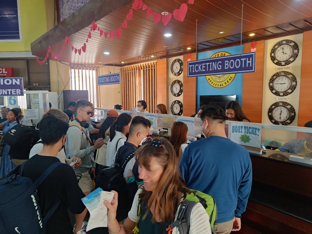 Caticlan was a small port that served the ferry to Boracay Island, visible in the distance. The port building was crowded with tourists, officials and bag handlers moving mounds of suitcases. The noise was reverberating off the tin roof and falling back down on our heads. We had a few more hoops to jump through before we could get on the ferry. First we had to queue to show proof of accommodation on the island….this may be a way of restricting numbers on the island but nobody was allowed on the ferry unless they had pre-booked accommodation. We were given a slip of paper which we had to hand in at another counter and pay our environmental tax (about €5), then armed with proof of that payment, we moved on to pay our port tax (€2.50 at another window) and then finally the boat fare (€1 at yet another window). We marvelled at the vast number of people employed just to get passengers on a boat. The process had to be done in that precise order which wasn’t obvious so people were queuing in the wrong place, changing lines and getting a bit excited. But at last, we were seated on hard yellow planks in a small ferryboat on the way to the paradise island of Boracay.