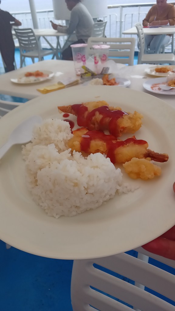 Although we had assigned beds on our tickets, we were told to just take any available bunk. We headed for the open top deck. We are not paranoid, but the safety record on Filipino ferries is appalling and the enclosed air-con tourist class was a little too enclosed for our liking….especially if you had to get out in a hurry. The ferry wasn’t full, and the top deck was virtually empty except for loners and the prudent. The engine noise was loud up there but that was compensated by the lack of human noises. it was a lovely constant noise that lulled us to sleep for a few hours. The crossing was smooth with a light breeze providing natural aircon. This ferry (2Go company) wasn’t fancy, but it was a giant step-up from the other long ferries we have taken. There were life-vests on all the bunks and also in the canteen area, the aisles were clear of crates and boxes, the toilets were (reasonably) clean. The morning dawned hazy and overcast. Meals were included in the ticket price (€54 each), and by 6 am, a long breakfast queue had formed, a bit like a soup kitchen. Everyone was given a plastic plate with a large mound of rice, scrambled egg, and some beef cubes ( the choice was simple – ‘take it or leave it.’ )The process was repeated at midday with rice and battered shrimp smothered in ketchup. Hardly gourmet, but nobody wanted to give up a ‘free’ meal.