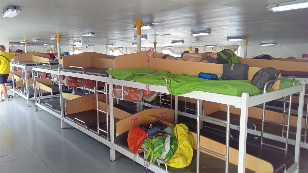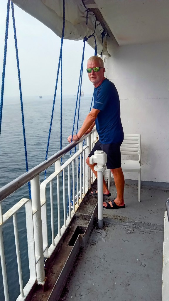 Once we entered the main departure area, all bags had to be placed in a single row on the floor so that a sniffer dog could check them out. The problem was that the single row already snaked down and around a vast hall (the amount of luggage that some people were carrying was staggering) There was much unintelligible shouting and gesticulating by a very officious steward….even the Filipinos didn’t know what was going on. They just shrugged and smiled. We were told that we had to wait and put our bags in a second row once the first row was checked. The dog came, sniffed the first few bags, some ID documents were scrutinised, and the first twenty people were even body searched. Then it all went a bit haywire….more shouting when some people tried to remove their luggage. In the ensuing mayhem, the stewards weren’t sure which bags were checked. We just sneaked out the door and headed for the boat….Caoimhin loves breaking the rules.