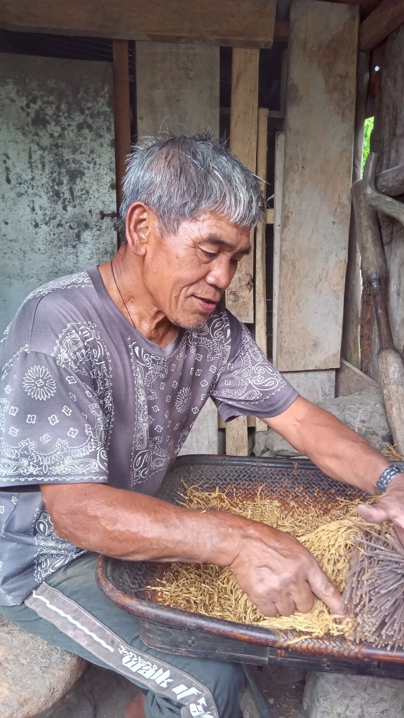 It’s hard to say how many of these children will remain in the village in the future. The children go to elementary school in the villages but then go to high school in the towns where they stay with relatives. Growing rice and maintaining the terraces is labour intensive and incredibly hard work -a long, back-breaking process. The number of older people bent double was alarming and sad. The way of life of the Ifugao People is still ruled by ritual and ceremony. The colours of the traditional clothes denote your caste and how many rice terraces you have. The tribal priests play a big role in life and death. The suitability of a marriage partner may be decided by the examination of the bile of a dead chicken. If the bile is ‘bad’, the union will not be blessed, but Feny said that you could always kill another chicken until you got the ‘right’ result. The celebration of an engagement was also a big event. The bridegroom’s family must bring a pig to the girl’s’ family home. The pig is slaughtered there, and all the neighbours who are present are given a hunk of raw meat.