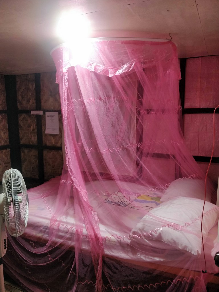 This was a homestay in a small village near the Chocolate Hills run by three widows – Fely, her sister Maria and their eighty two year old mother. Our small room was a riot of pink, pink walls, pink mosquito net. The rain hammered on the roof while a little stream flowed almost under the floor so we had water above and below. What made this special was the friendliness of the women. (A bargain at €7 a night)