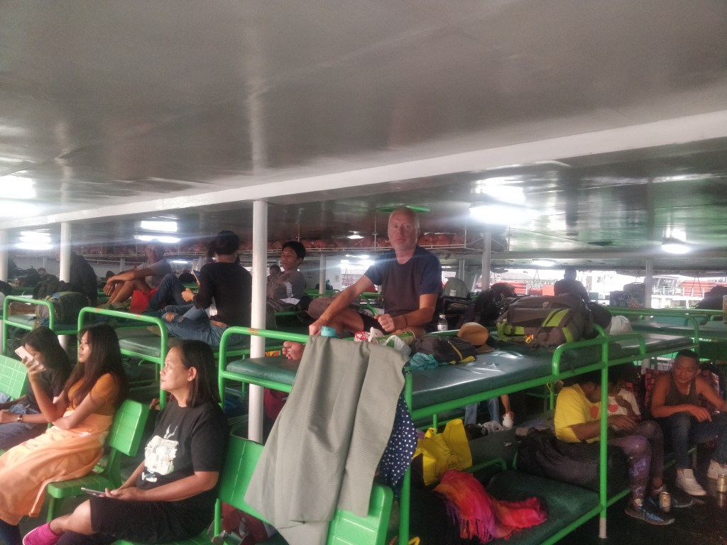 - When we laid eyes on the ferry that would take us across the Sula Sea from Panay to Palawan. The ferry had a pretty name- the Marta Rebecca (or maybe the Maria Rebecca)….the rusting made it difficult to decipher😮. It had the tired, worn-out look of a vessel that needed some TLC or preferably retirement. We were appalled and that was before we saw all the boxes and crates of cargo going on, clogging up bunks and corridors. But we survived the thirty nine hours aboard this rust bucket (including two nights)