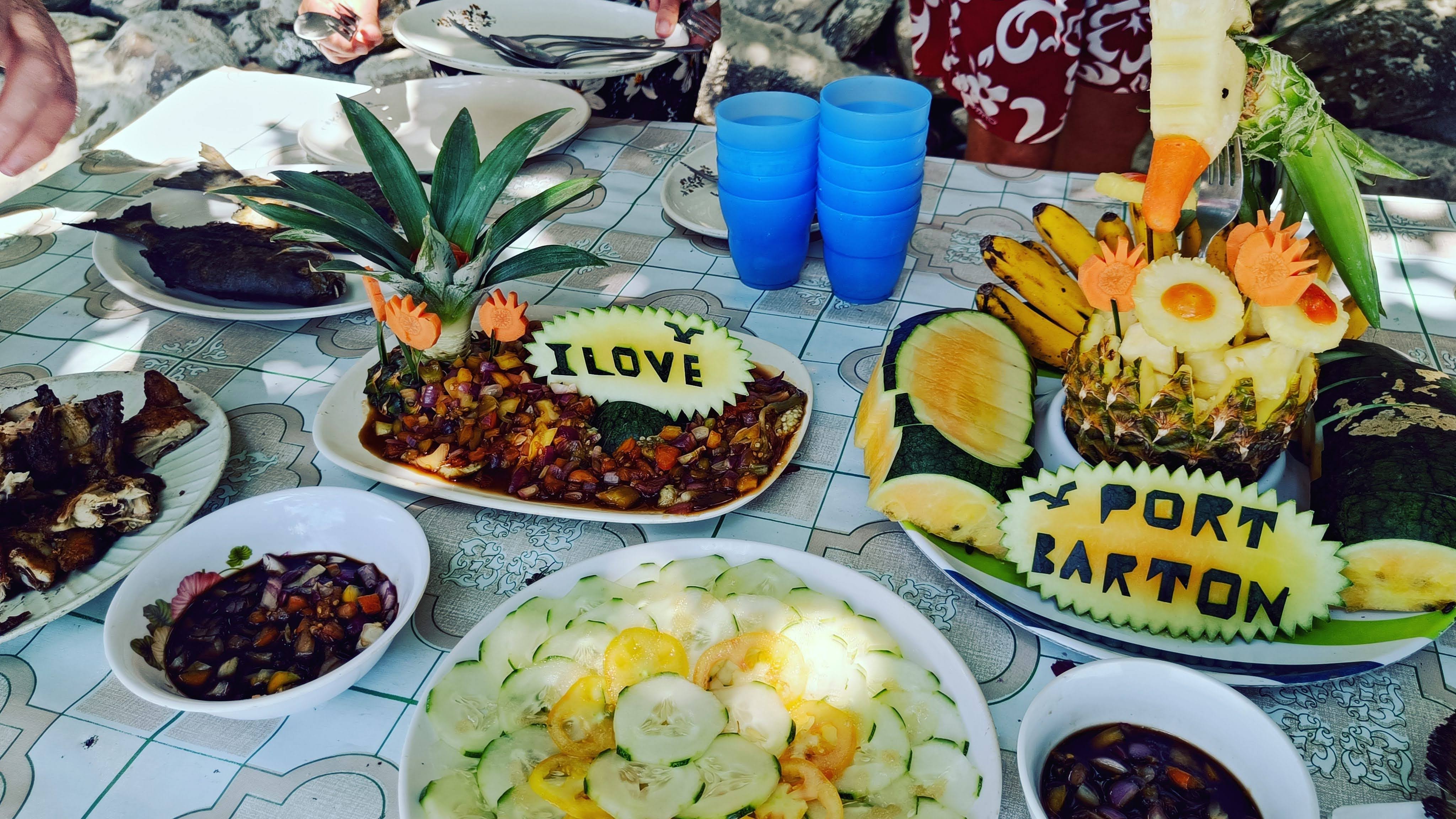 In a meat-eating, chicken loving culture, vegetarian food was not easy to come by. Even vegetarian noodles on the menu often came with pork and chicken bits! (When I queried it, the waitress said that it was mainly vegetable) Luckily I eat fish and the fresh seafood was delicious. The best meal was probably on one of the island hopping tours Three cooks toiled away at the back of at the boat all morning cooking lunch on charcoal coals, sweat and heat but increasingly delicious smells. Platters of food were brought ashore to a small island and set up on a table on the sand – prawns, crabs, barbecued fish, mounds of rice, noodles, fried chicken, chicken stew, pork in sticky sauce and platters of fruit.