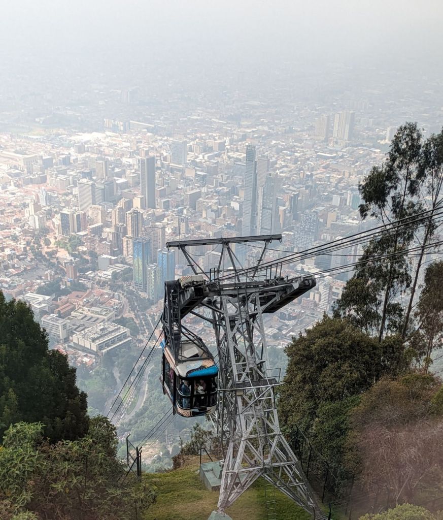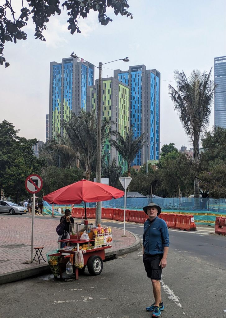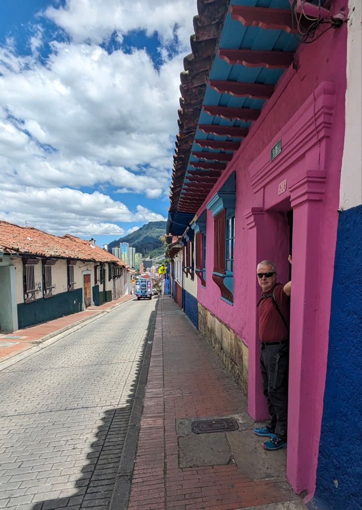 Traversing Bogotá pre rush-hour took at least an hour and involved two buses. We travelled through quiet shopping streets with the usual international stores(like Ikea) past skyscrapers and parks. A flower market was just opening it’s stalls and a few homeless were stirring under blankets of cardboard. There was graffiti and wall murals everywhere we looked. It was a bright chilly morning, about 7C, and there was a soft light on the green hills that surround the city….Bogota is built in a valley with buildings spawling up the steep slopes of the hills. Our phones buzzed, Google Maps telling us where to get off and we stepped bleary-eyed and jetlagged onto the colourful streets of Candalaria, the old historic part of town with its brightly-painted, 300 year old houses, cobbled streets, cafes, churches and…. steep hills. That first morning, we struggled to a lovely apartment that we had booked for three nights((Morph, €33 a night) feeling a little woozy, gasping from tiredness and altitude….Bogota is at 2600m. But soon we discovered the grocery/bar where the locals hung out and the beer was €0.60 a bottle🍻 There was a strong police presence in the area with officers on many street corners with big muzzled rottweilers. Despite that- or maybe because of it – the area felt calm and safe.
