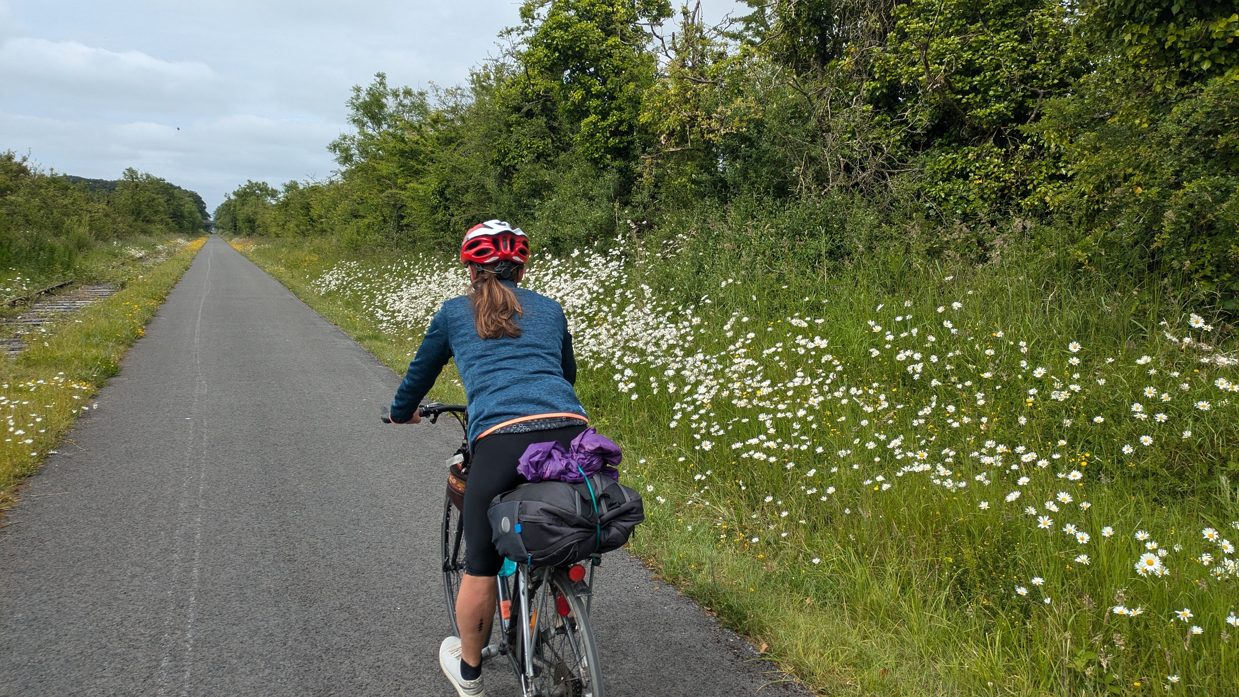 It was very quiet mid-week with just a few other cyclists and the occasional dog-walker.  Most of the time, the only sounds were birdsong, the whirr of our tyres and the infrequent hum of a tractor working in the fields. The verges were full of  perfumed wildflowers, banks of ox-eyed daisies, buttercups, hawksbeards and ferns while elder trees flowered overhead. We cycled under lots of arched stone bridges and along by frequent storyboards telling of the flora, fauna and the history of the area including some complex characters like Sara Kelly, a woman who went from being a destitute unmarried mother to the richest female landowner in the British Isles and who was murdered in Ballinderry, Moate in 1856 probably by some disgruntled tenants that she had evicted.