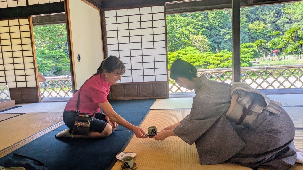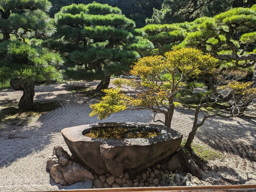 Tea and Shade We were charmed with a visit to Ritsurin Gardens in Takamatsu with it’s beautiful teahouse of bamboo, screens and cushions. The windows framed the outside view like serene paintings and we drank tea to the gentle sound of flowing water from the small waterfall outside. In the coolness of the teahouse, we began to appreciate the Japanese fascination with light, shade and symmetry and to understand the philosophy that ‘less is more’