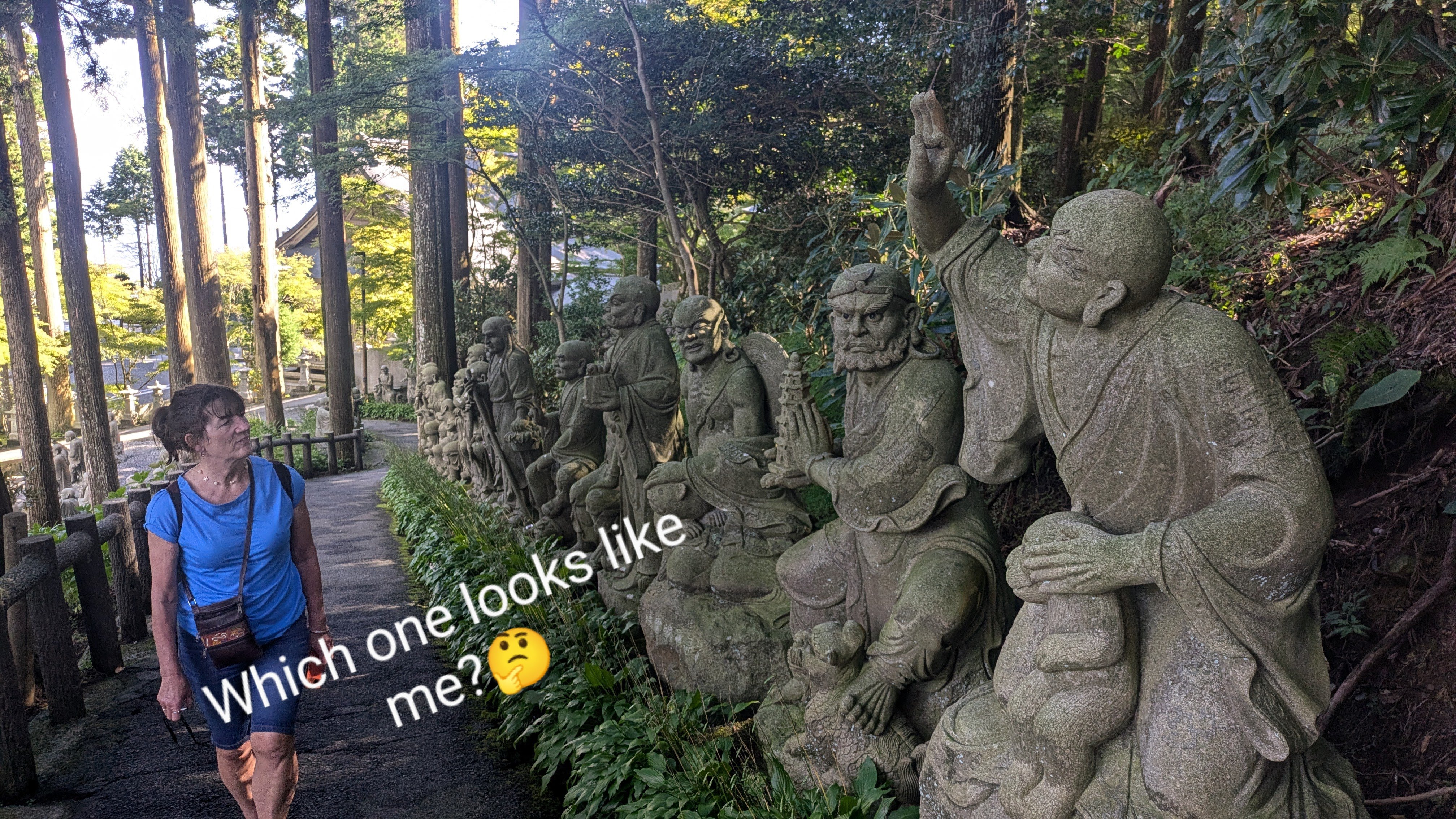 Temple in the Clouds All over Shikoku, we saw pilgrims on the Pilgrimage Trail of the 88 Buddhist Temples. This is a long route, over twelve hundred kilometres, which circumnavigates the entire island of Shikoku. Most pilgrims do it in sections but we met a few who were devoting six to eight weeks to completing the entire pilgrimage in one go. Many had sore feet as the majority of the route is on hard road surfaces. Although we didn’t do the pilgrim’s trail, we visited several of the temples. Our favourite was Unpen-ji, the highest of the 88 temples and often called The Temple in the Clouds. Hundreds of life-sized statues of Buddha’s disciplines lined the walkways among the cedars. It’s said that if you look hard enough, you will find your likeness among them. Although I searched and searched, I couldn’t find mine