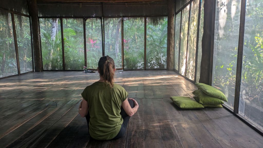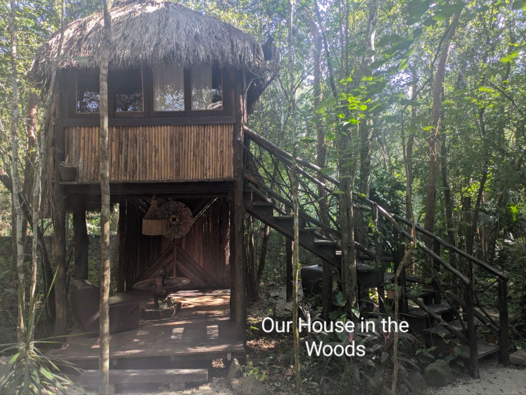 We turned inland to stay in a little wooden cabin in the jungle(Madre Tierre Eco) near the little town of Leona Vicario.The air was full of birdsong and the cabins were almost hidden by the tall trees. There was a yoga studio, an outdoor kitchen and very few guests. Birds flitted around the small pools , dipping to eat the insects floating on the surface. The only downside was that there was no fridge.
