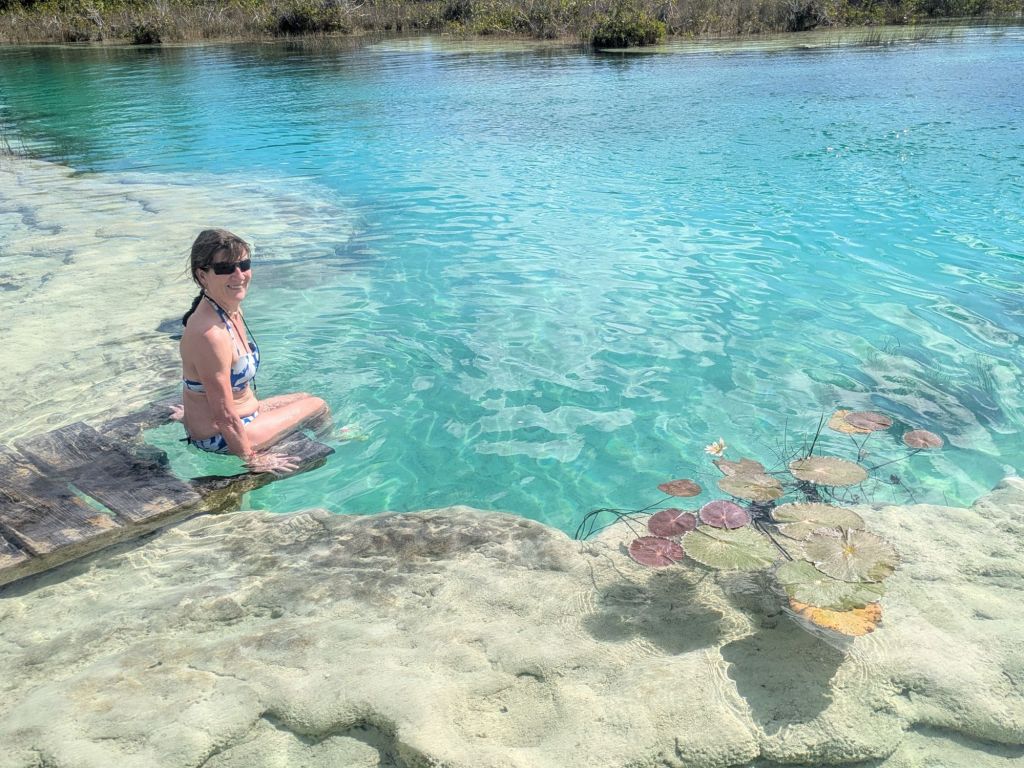 But this morning, we visited Los Rapidos Bacalar, a natural lazy river and floated effortlessly in crystal clear water along a narrow section of the lagoon lined with white, gleaming stromatolites and mangroves. (Stromatolites are layered sedimentary formations created mainly by photosynthetic microorganisms). We also visited Laguna Bonanza, which was a beautiful, quiet place to hang-out near a stunning section of the lake.