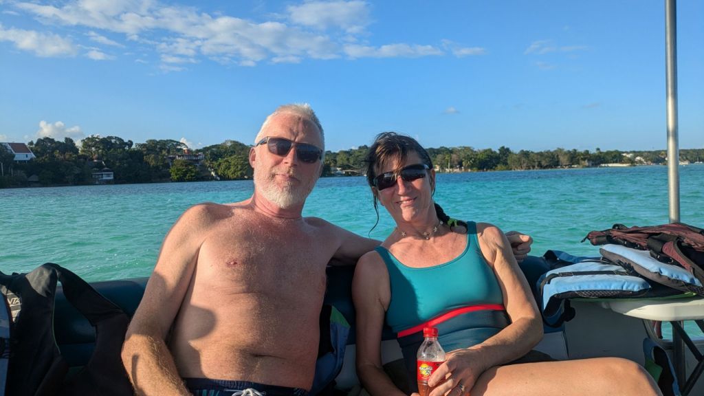 Bacalar Lake is known as the Lagoon of Seven Colours (La Laguna de Los Siete Colores). It’s almost mandatory to take a boat trip out on the lake to fully appreciate it. We chose the sunset tour which was 3 hours on the lake visiting the pirates path, the island of the birds, and cenotes (underwater sinkholes that dramatically changed the colour of the water depending on the depth.) The sun slipped down behind the town, turning the lake-water golden. On the tour, we met three German women in their early seventies who were driving around Mexico for a couple of weeks and having a ball. The only problem they had encountered was a puncture which they acquired when they hit one of those invisible speed bumps. They spent their time on the boat, giggling and trying to get the perfect photos of each other, almost like far younger Instagram influencers.