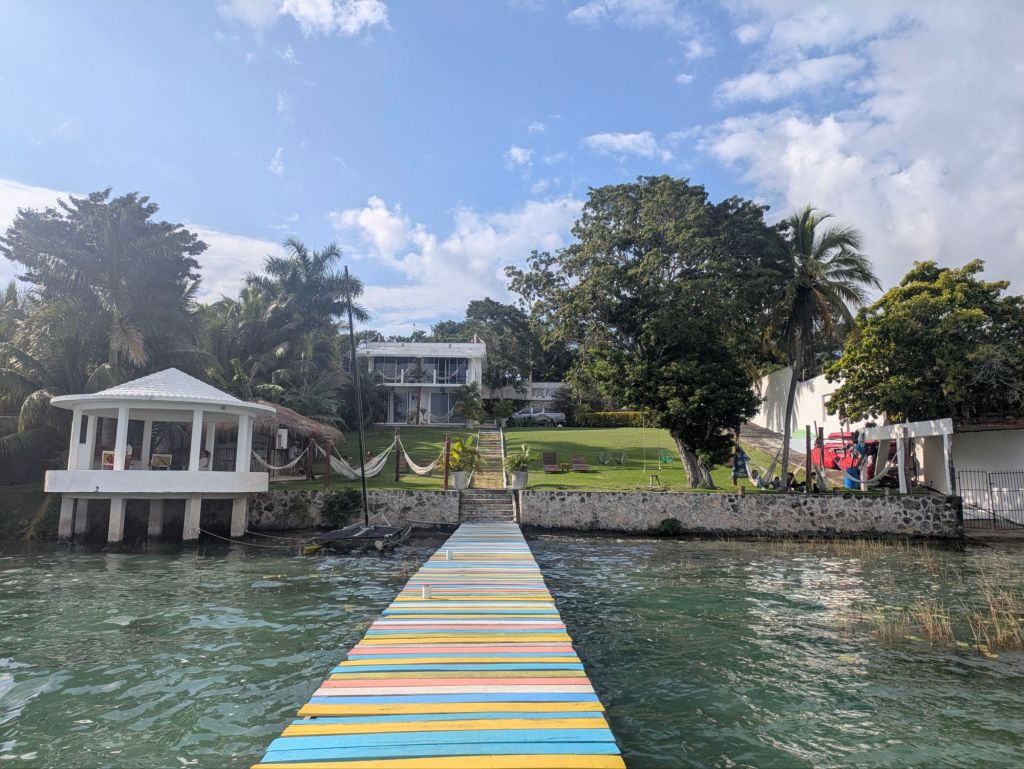 Although our apartment was in the non-touristy ‘local’ area and a twenty minute walk away from the lake, it included free access to the Bacalar Tropic Beach Club which was one of a series of lakefront hotels and houses on the southern end of town.  There was no ‘beach’ but there was a grassy area in front of the hotel with loungers, hammocks, swings and a multicoloured boardwalk – a great place to enjoy the lake.