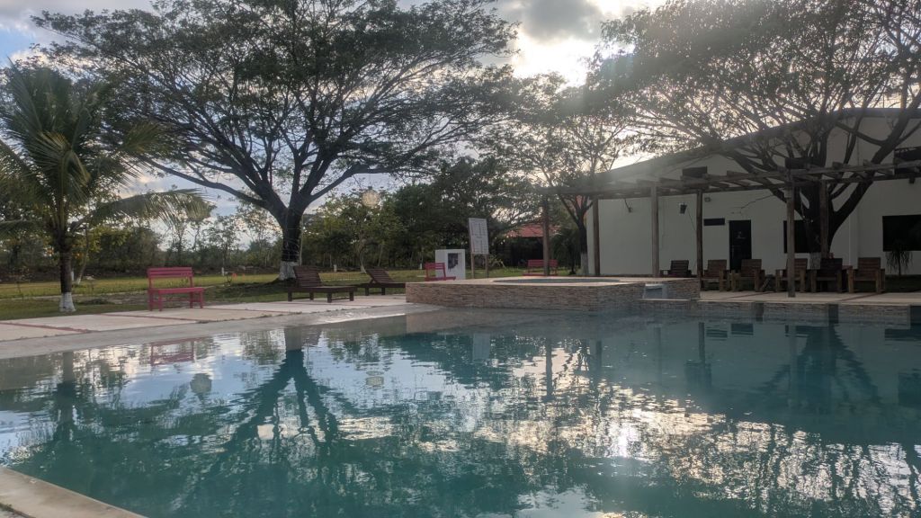 Hotel Real Primavera Campeste was relatively expensive  (€49 for the night) for a hotel that was really in the middle of nowhere but we needed somewhere to break the journey to Palenque. The hotel avenue was long and lined with trees, the gardens were landscaped and the rooms were spotlessly clean. It was a place that could accommodate a crowd but the only other residents were three men driving from Monterey in California to their home to Belize. They were also breaking their journey at the hotel. Apart from us,  a flock of long-tailed Grackles made good use of the pool, dipping and  diving at dusk