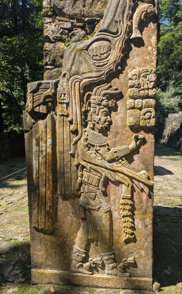 In the excellent museum, we saw a replica of the sarcophagus of the Red Queen which was only discovered in 1994 in a temple beside the large Temple of the Inscriptions where Pakal was laid to rest. The Red Queen is believed to be Pakal’s wife and she got her name because of the bright red dust made of cinnabar (a red mineral made of mercury and sulphur) that covered her skeleton when she was discovered.  She was also buried with two servants and copious amounts of jade and pearls.