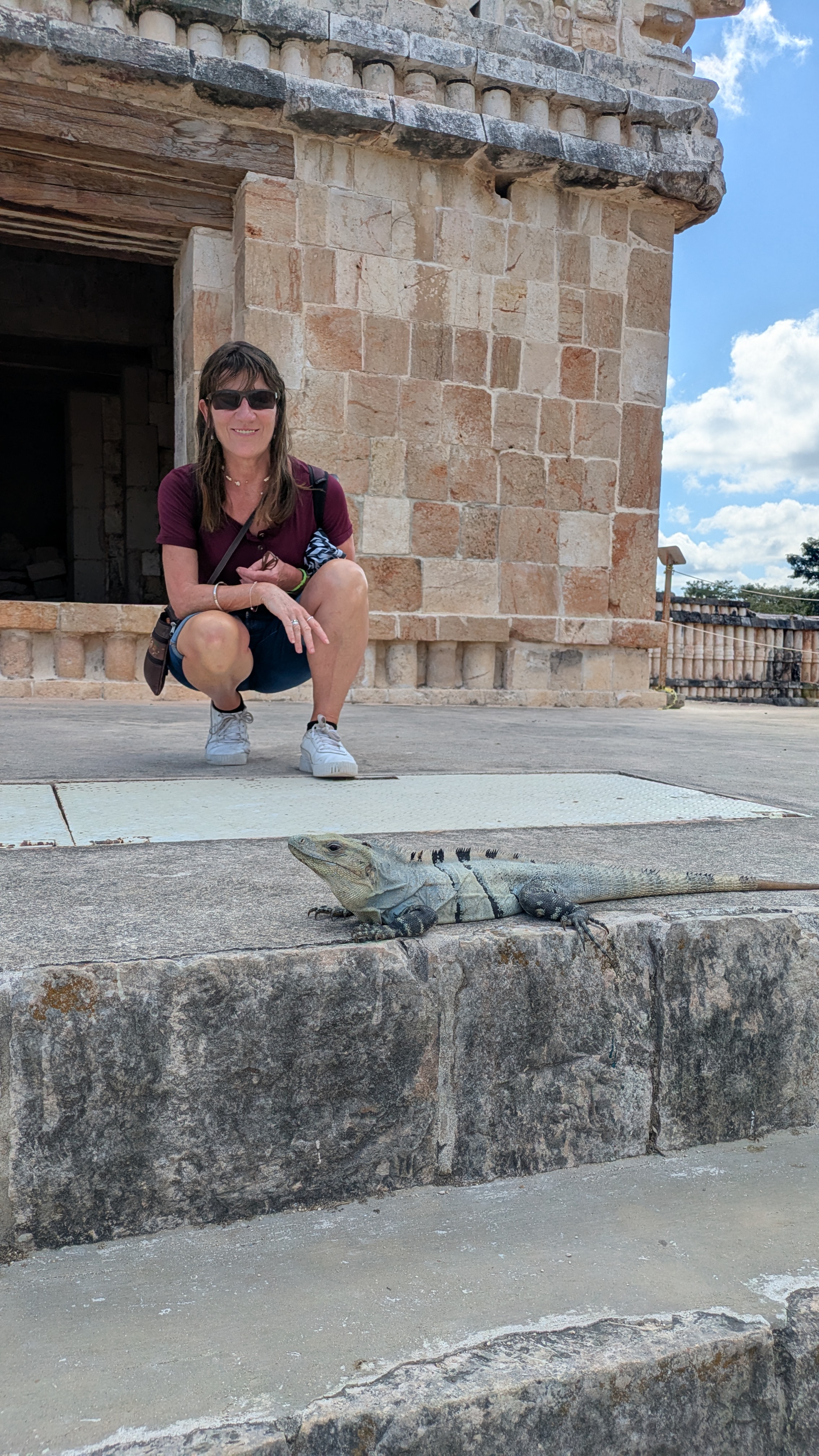 Swallows flew around the quadrangle flanked on all sides by the ruins of ancient monuments.   Bats were hanging upside down in the dark recesses of the buildings while giant iguanas snoozed on the hot stones. We were in Uxmal, another archaeological site where most of the buildings dated from the seventh to tenth century AD and were unlike anything that we had seen before now. Many of the buildings were decorated with intricate bas reliefs and were arranged in several quadrangles around immense plazas, some linked by beautiful arched passageways. It had an almost modern feel  and  was undoubtedly a well-planned city with an orientation along astrological lines.
