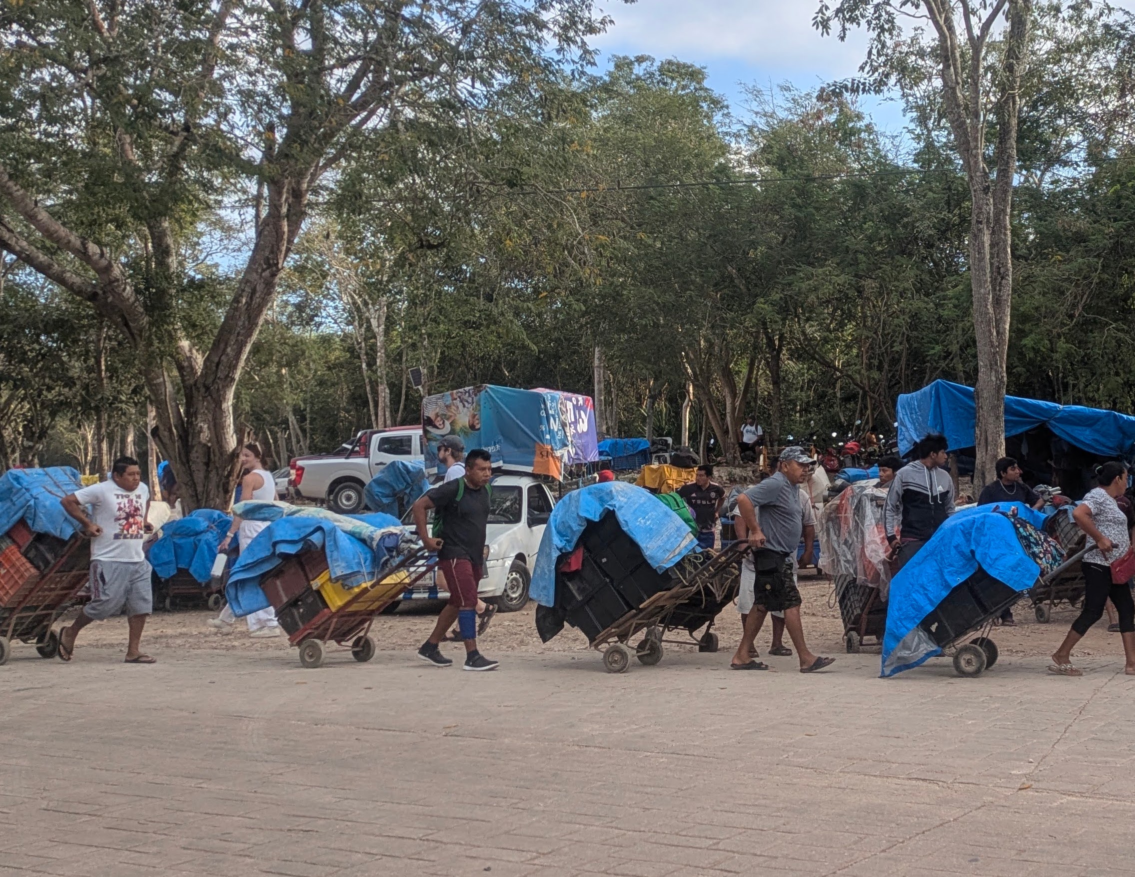 It was a different story when we visited Chichen Itza the following day. In a country with a plethora of archaeological sites, this is one of the ‘big guns’, an UNESCO heritage sire since 1988 and regarded as one of the world’s best preserved archaeological sites. We had been warned to go early as it was really popular.   As we approached the site shortly before eight o clock, we were greeted by the strange sight of a long line of people pushing carts loaded with boxes and bags as if they were refugees, fleeing with all their worldly goods. These were just the stall vendors making their way into Chichen Iza for the 8am opening.