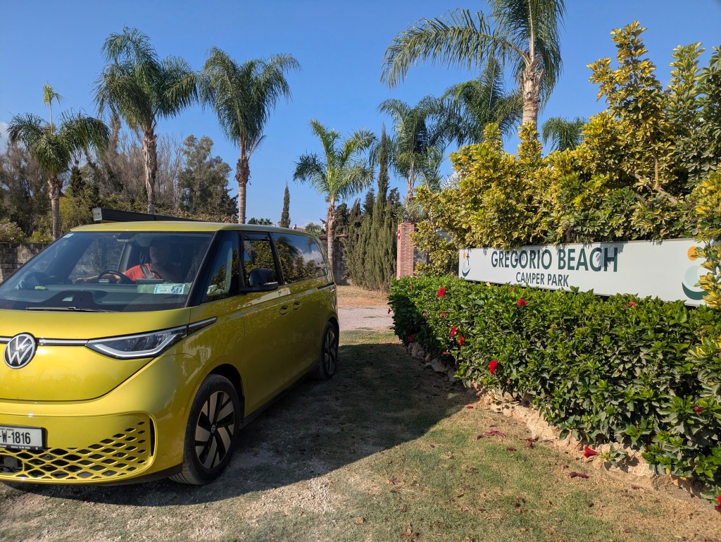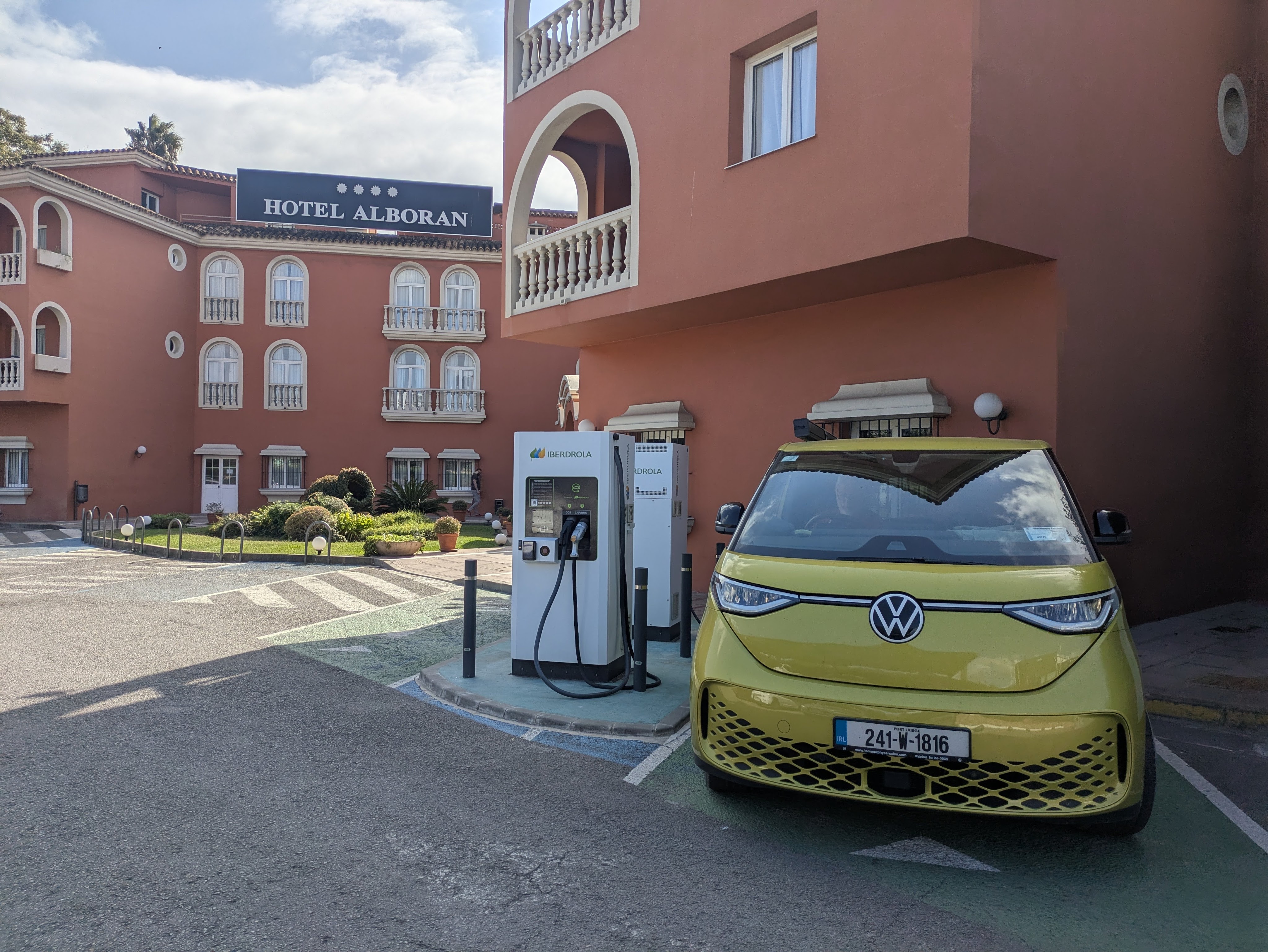 We tried to charge (Cepsa Chargers) in a garage forecourt near a Chino Shop where we bought camping gas canisters but the chargers were powered down and covered in dust. Then on to Ionity chargers down the road. Sun blazed on the screens making them opaque and impossible to read. Sweat dribbled off us and I searched for my umbrella to provide some shade and maybe make the instructions on the charger screen legible. Although €40 was taken from Caoimhin’s bank card to validate it, we couldn’t get them to work. We next stopped along the road at a casino which had two Tesla chargers…these might have worked but they were only slow chargers so we pushed on and stopped at an Iberdrola charger outside a hotel on the outskirts of Algeciras. The Buzz charged to 100% here without issue and….best of all, the charging seemed to be free (the cost hasn’t been deducted from my bank card…yet)