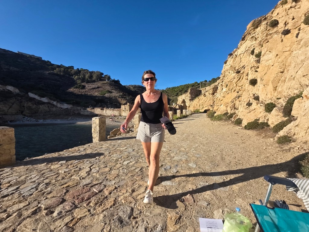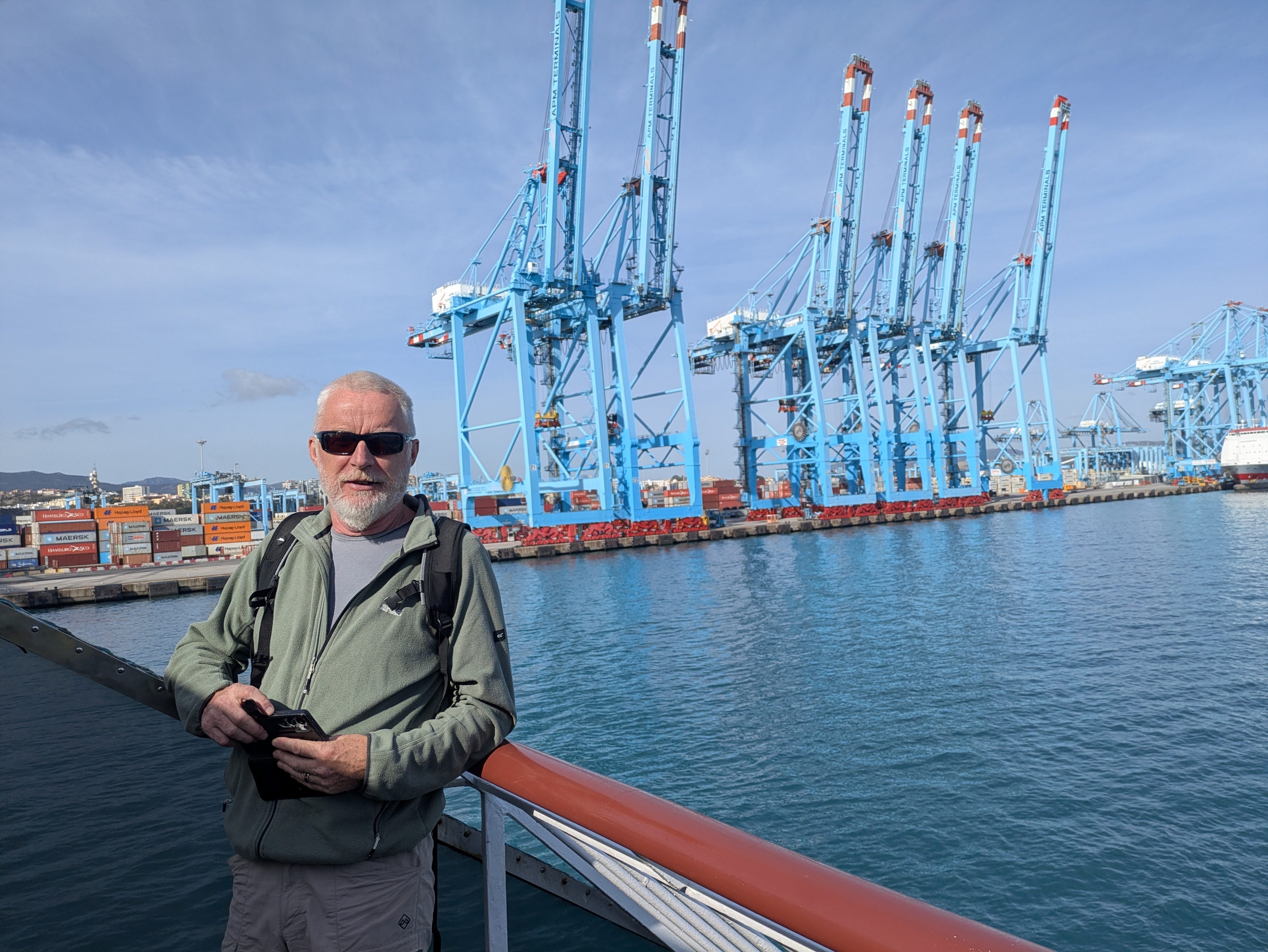 The following morning was cool, a few people came to watch dolphins out in the bay and a couple of spear fishing- guys got all their paraphernalia ready, donned wetsuits, while talking incessantly and headed into the water, armed with their spear guns. No-one disturbed us, the dog walkers waved at us. Our one-hour ferry was calm and uneventful. The port of Algeciras was busy, ports were always fascinating with their cranes for lifting, their lorries and container ships and the buzz of transporting goods.