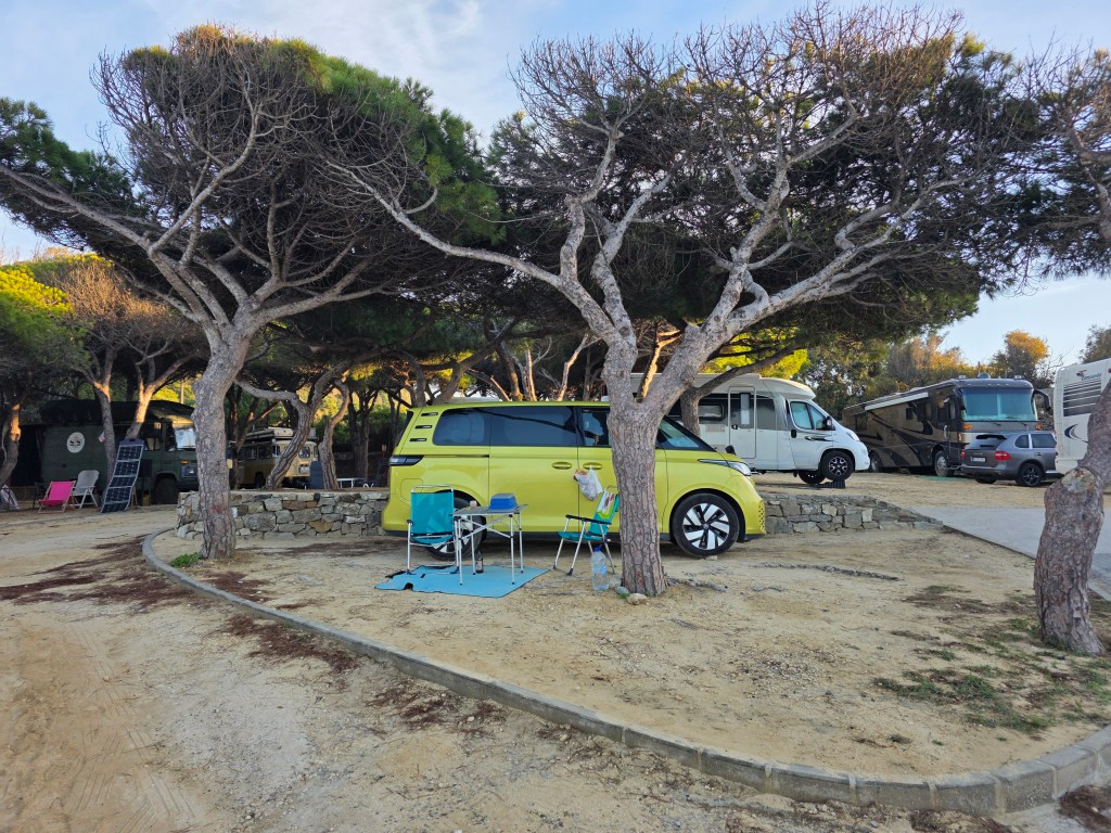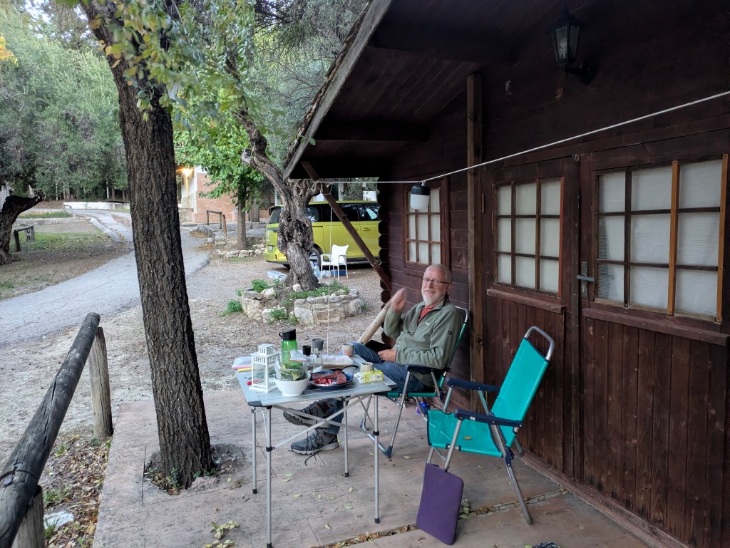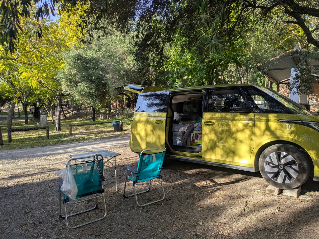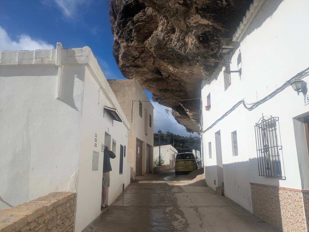 We charged the Buzz in Arcos de La Frontera, a white village, about forty minutes outside Cadiz, with an impressive hilltop castle. What bliss to have the choice of four different charging stations within three hundred metres of each other, but the downside was that we had to pay. After charging, we continued on to El Bosque , a village in the gorgeous Sierra de Grazelema in glorious sunshine although the area was reputed to have the highest rainfall in Spain. The Buzz blended in with the autumn colours in the campsite where we were the only visitors. The weather was dry although the wind became gusty, peppering the roof of the Buzz with leaves and twigs and sending us sheltering on the veranda of an empty cabin. The chomping of the naked sheep (very closely shorn) in the nearby field sounded like raindrops but the rain didn’t come until mid-morning, a persistent soft drizzle, reminiscent of the West of Island.