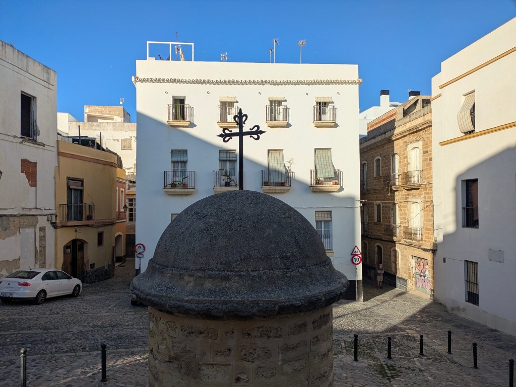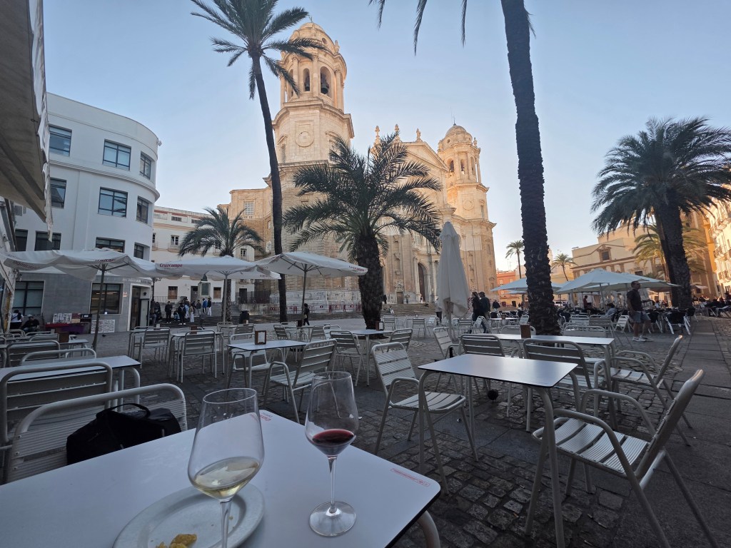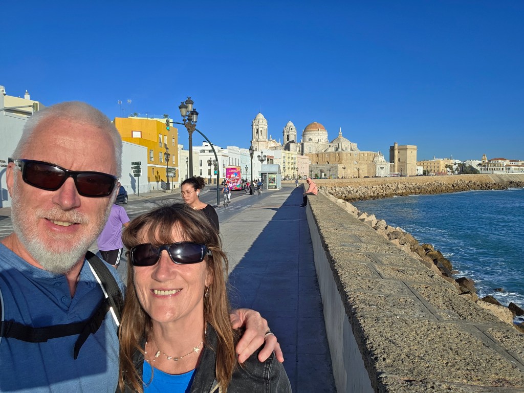 Onwards to Cadiz, a place that we had never visited before. The road was wide but bumpy – the road surface in Morocco was much better than Spain. White villages gleamed on the hilltops among pine forests. The approach to Cadiz was flat and marshy, a spaghetti junction of roads, underpasses and roundabouts before crossing over La Pepa Bridge, the longest bridge in Spain, five kilometres with three of those over water.