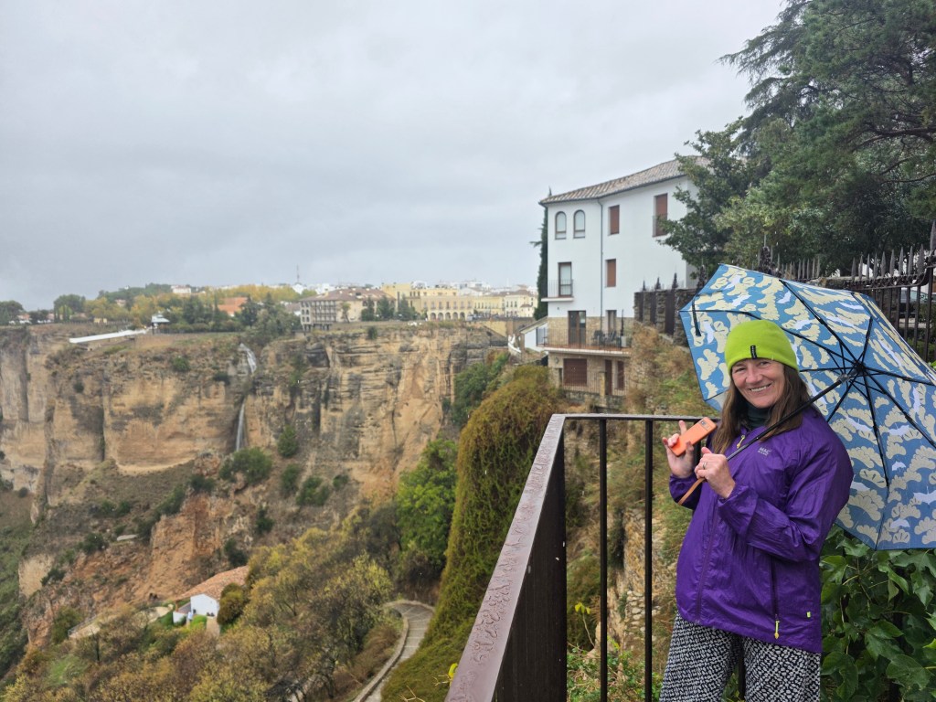 Rivers of water sloshed down the old cobbled streets of Ronda, soaking our shoes and socks, and seeping through my jacket. We splashed through winding streets, trying to find the mirador, the famous view of town, perched on the edge of a high cliff with a 100m chasm and misty views of the Serrania de Ronda. Despite the weather, Ronda looked impressive and we might return sometime.