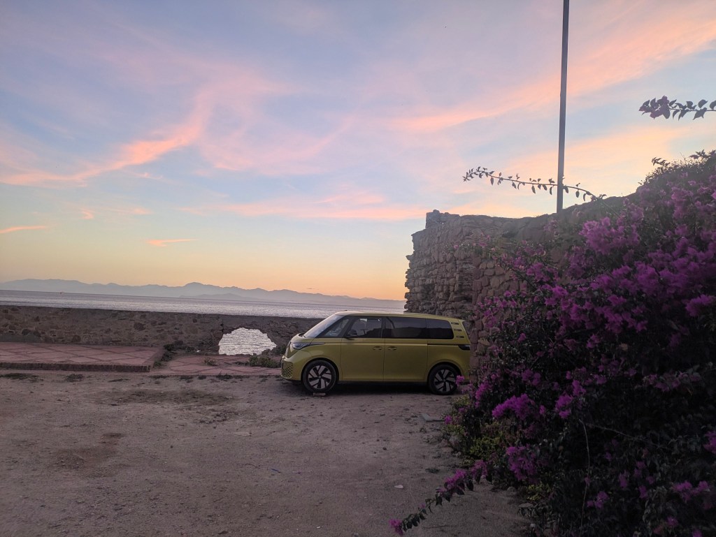 Our passports were looked at and we were waved on with a smile to queue at customs. The sniffer dog sniffed, but didn’t find anything of interest, the officials were relaxed and even chatty, commenting on the electric van. There was more queueing to get our passports stamped with exit visas and phew, we were out of Morocco and nobody had looked for any car documents apart from the little white card we were given on entry. Now we just had to get into Spain. Five vehicle lanes shemozzled to get into the two lane track for the Spanish border. More passport checking, some fingerprinting (a new addition when entering Europe by land), a quick look inside the van and we were through, driving into Ceuta. The whole process took less than two hours unlike the almost five hours it had taken us to enter Morocco.