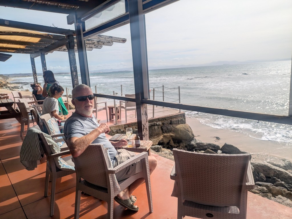 We headed west towards Tariffa and the Costa del Luz. The roads were winding, the countryside parched and at one stage, the blackened evidence of an old hillside fire. We picked a campsite at random – there were loads stretched along the coast but when a bored woman at reception told us it was €27 to park for one night, we were so shocked at the price that we continued on – must be the Morocco effect where everything was so much cheaper (apart from alcohol). We spent the night at another campsite overlooking the Atlantic with crashing waves, kite surfers and even a beach bar set up on the rocks. This was in danger of being washed away with the exceptionally high tides with the waves crashing over the veranda and foaming under the seats. The campsite was surprisingly busy, full of Germans, many with babies or toddlers or dogs or all three.