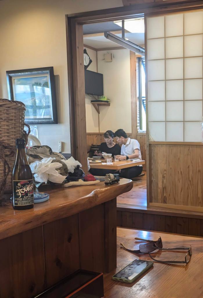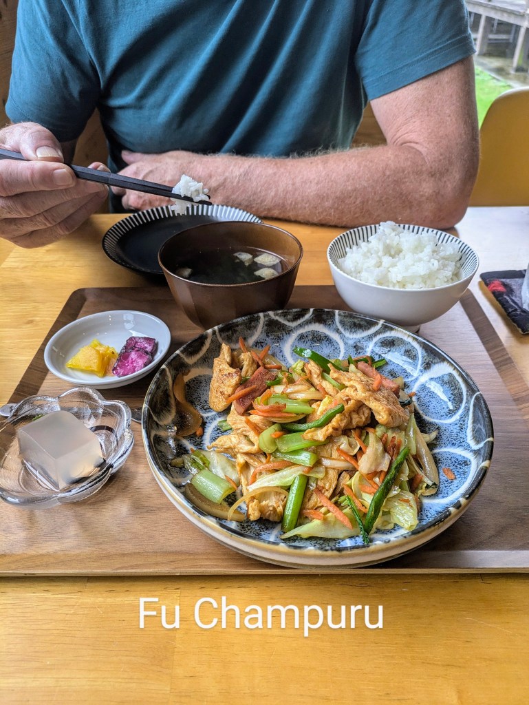 We have become fans of Japanese food although we had rarely eaten it before coming here. However a word of caution to vegetarians –  a strict vegetarian would probably starve as even the miso soup has a meat base and tofu floats alongside slivers of pork or beef.  So we opt for as little meat as possible but even the meat dishes aren’t very ‘meaty’ and there’s usually lots of fresh vegetables.  Google Translate lets us down at times when we are looking at menus.  We thought that we were ordering the local dish of the Amami Islands (Keihan) which is chicken and rice but we got noodle soup with pork. The presentation and the attention to detail is truly magnificent, with a multitude of side dishes and garnishes.  There is such a high standard even in the cheapest places. Eating out is a real pleasure and much more affordable than at home ( we eat local as much as we can)A huge bowl of ramen is about €4 -€5, dinner main course is about €10 to €12 and lunch is cheaper. Some things take a little getting used to. When we ordered two beers, they were accompanied by a bowl of raw cabbage which should be dipped in a couple of varieties of soy cabbage and eaten with chopsticks….surprisingly nice. We haven’t even seen a knife and fork anywhere in Japan yet.