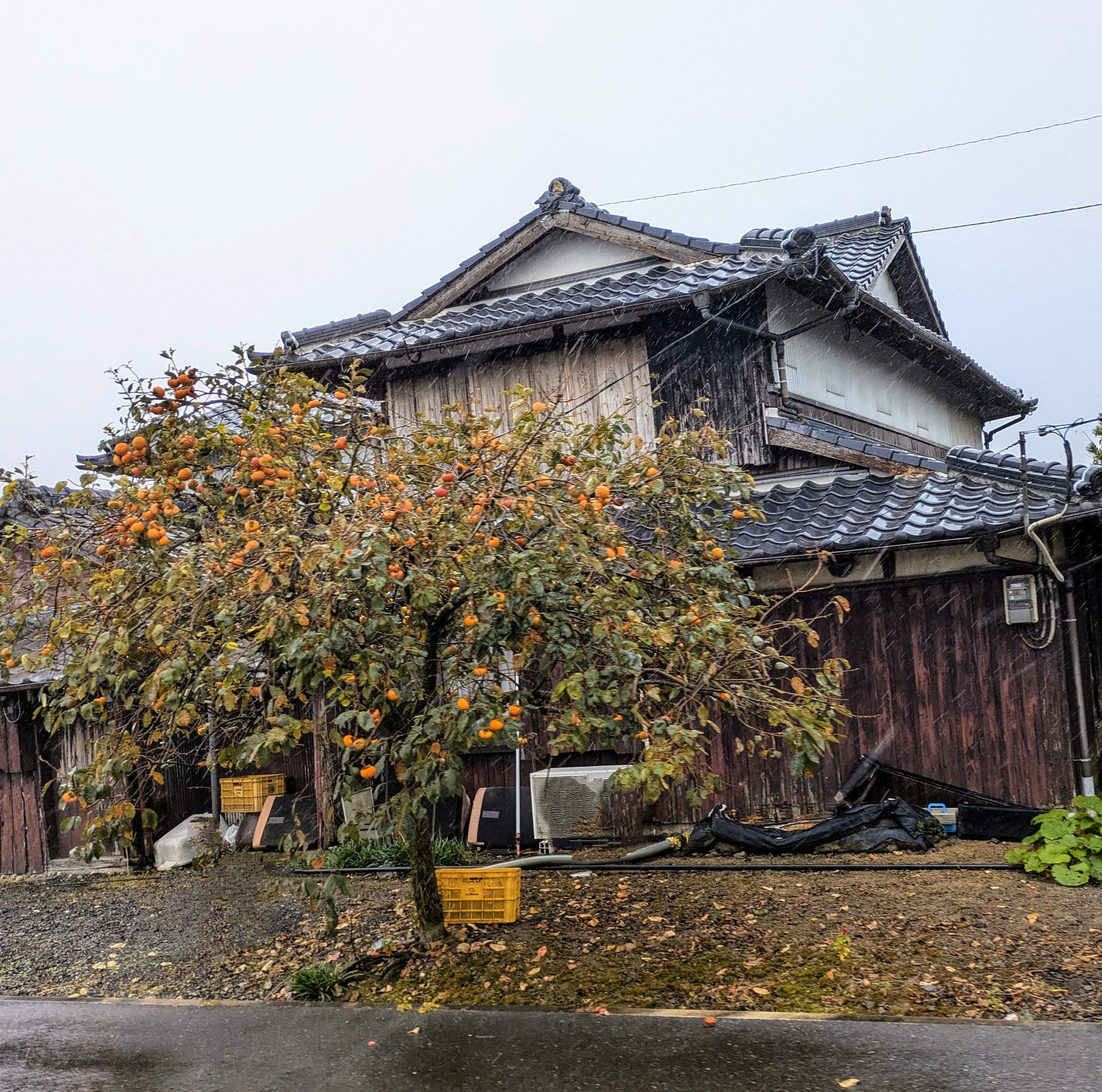 As we drive into the mountains out of Kumamoto, we can see the hazy peninsula of Nagasaki across the Araike Sea. Along the way, there are small farms and little villages by the shore, both traditional and modern houses, roadside shires and cemeteries. It’s mandarin season  and most houses have a persimmon tree outside with it’s ripening  orange fruit decorating the branches like balls on a Christmas tree. The land becomes flatter with rice and beans, tractors and enormous greenhouses.