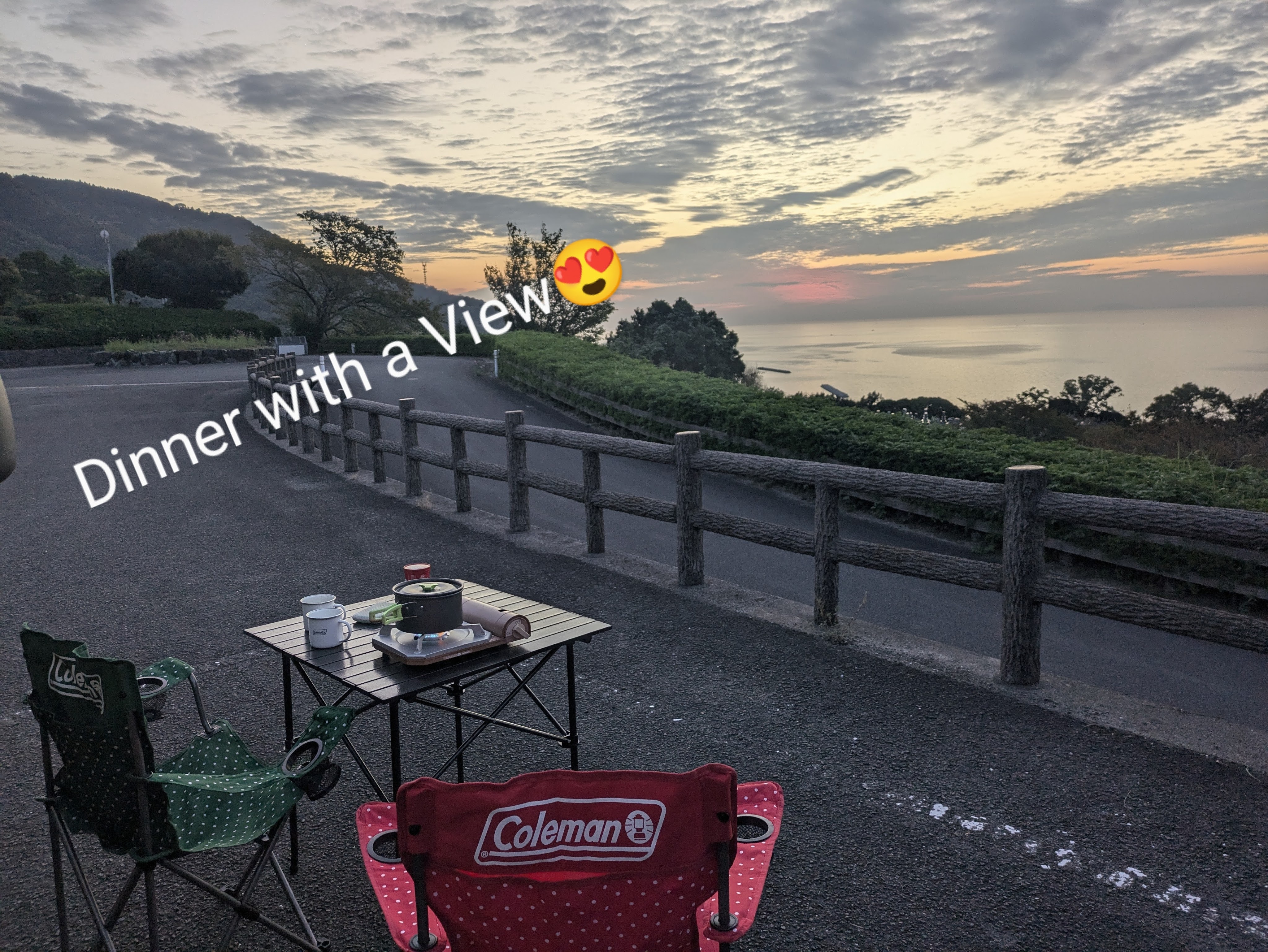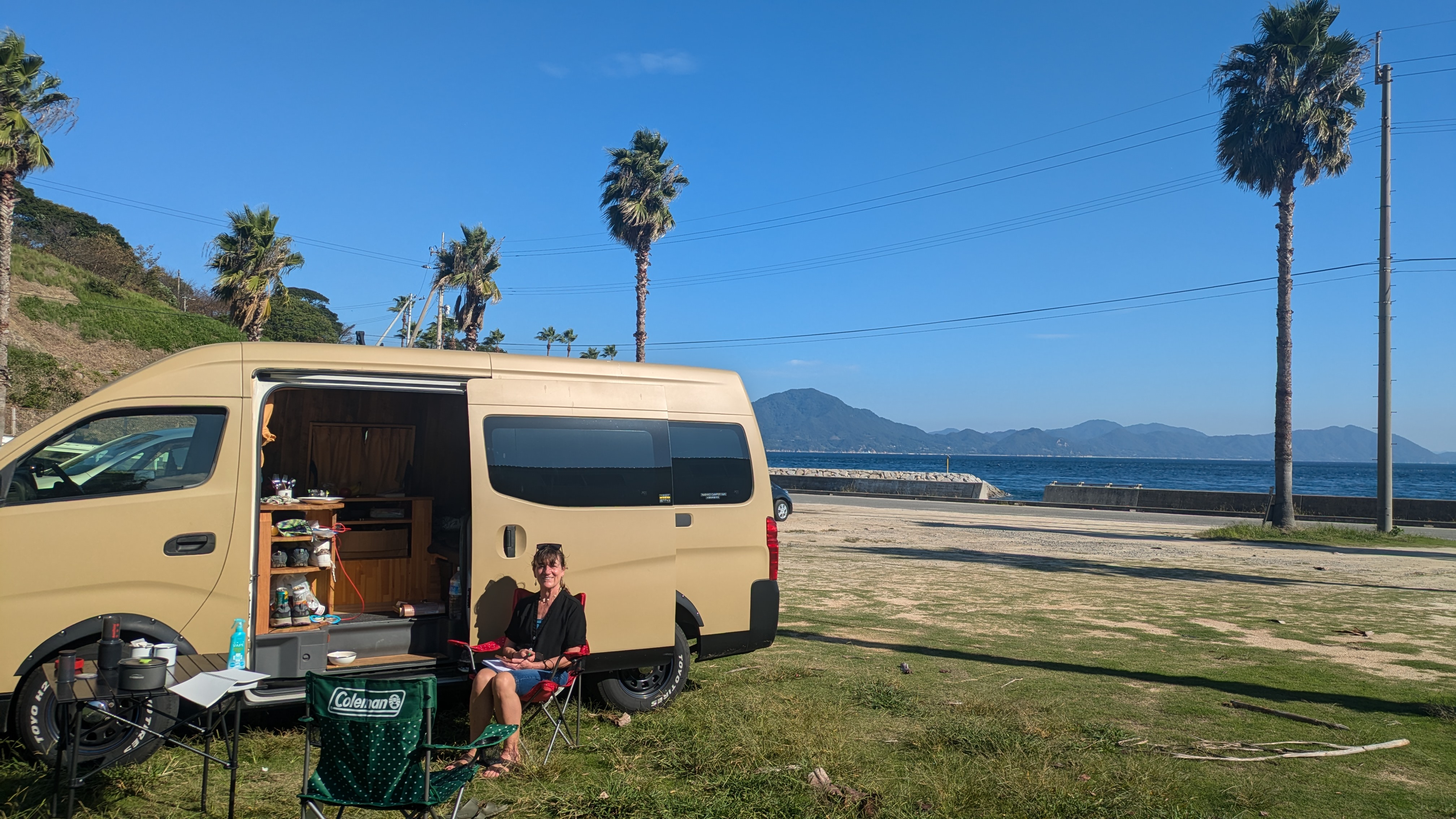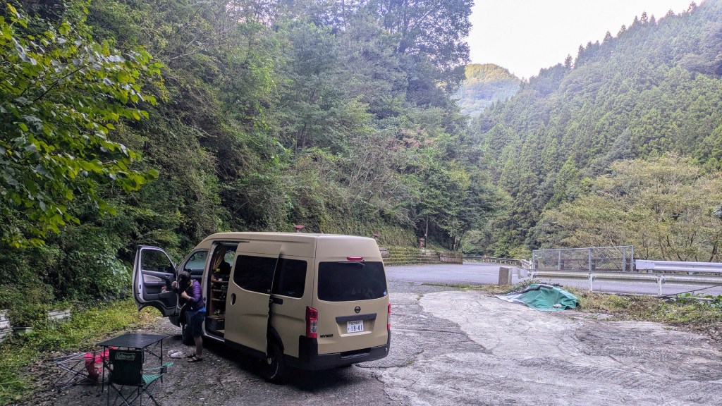 Last night we are parked up by Yadori beach, an idyllic spot on the edge on the forest. The temperature in the soft darkness was about 25C, there was a light breeze and we were enjoying some wine (which is surprisingly cheap in Japan). A man in a jeep stopped beside us to warn us about the danger of snakes in the region(all by Google Translate). That put a little damper on our evening, I even dreamt of snakes slithering in the van window that we had to keep open for some ventilation and I’m not even squeamish about snakes….usually.