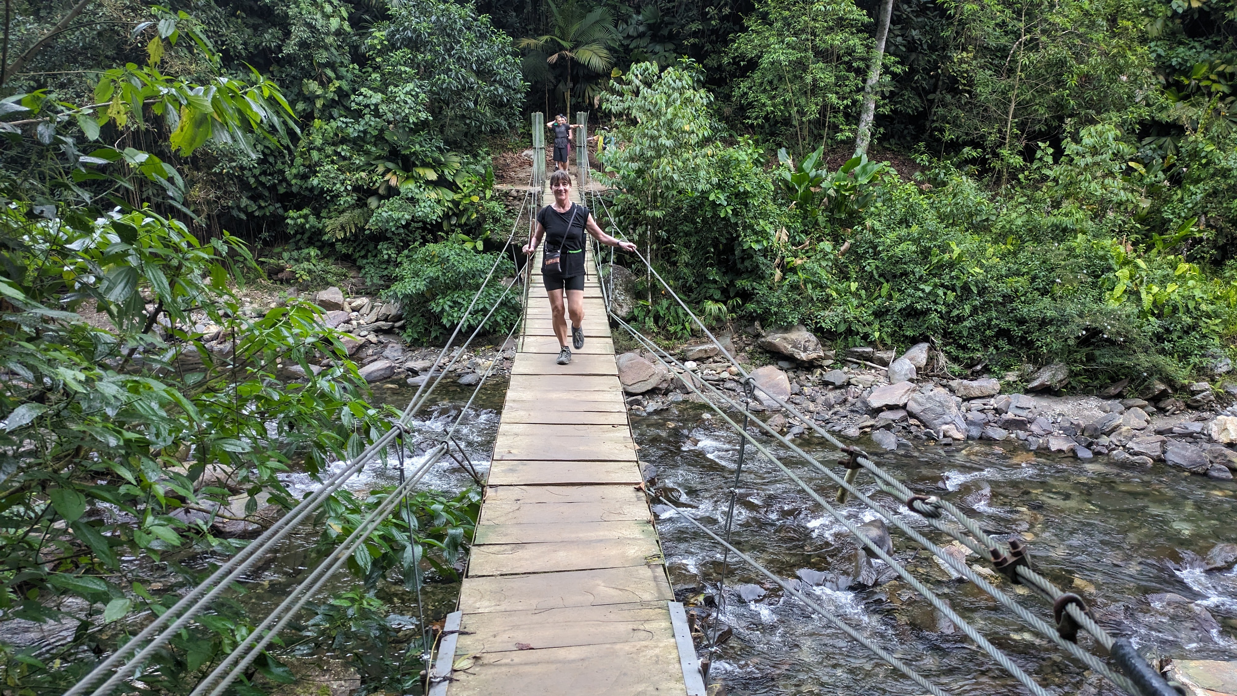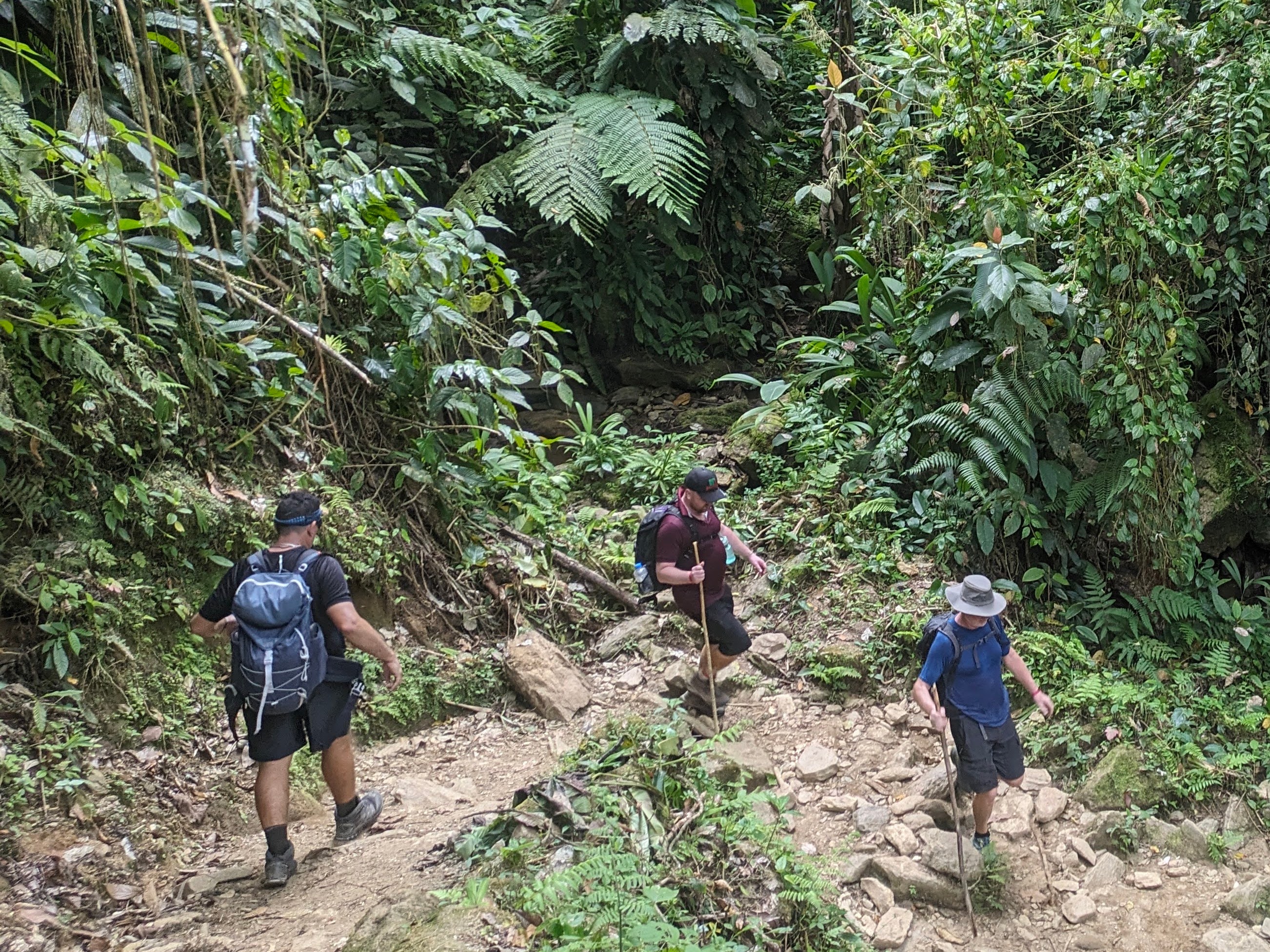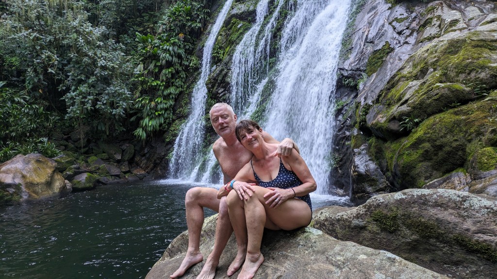 We weren’t quite so enamored when we were driving down through them a short while later. Visibility reduced to almost zero and the world became a thick opaque grey. It was almost impossible to distinguish road from verge on the twisty road. Thankfully the surface was reasonable and there wasn’t a lot of traffic. The mist and fog lightened every so often to reveal gigantic ferns and thick moss covered trees and we were fooled into believing that we almost down, only for it to thicken again and plunge us into grey again. It took almost an hour of white-knuckle crawling, but eventually we were below the clouds although we were still in the mountains and the temperatures rose.